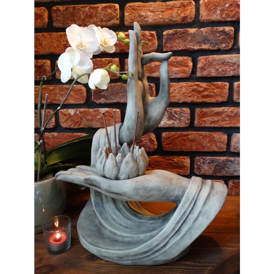 Schitterend mooi is dit sculptuur van 2 handen in yoga houding, perfect gedetailleerd, en grijzig ingewassen. Dit beeld is gemaakt van hoogwaardig massief gietsteen wat zorgt voor jarenlang sfeer genot. Prachtig is dit beeld in uw tuin, maar zeker ook binnenshuis, of in/bij uw bedrijf. Staat stabiel op stevige vloerplaat. Voorzien van losse waxinehouder, die in de hand past. maar ook op een andere plaats neergezet kan worden