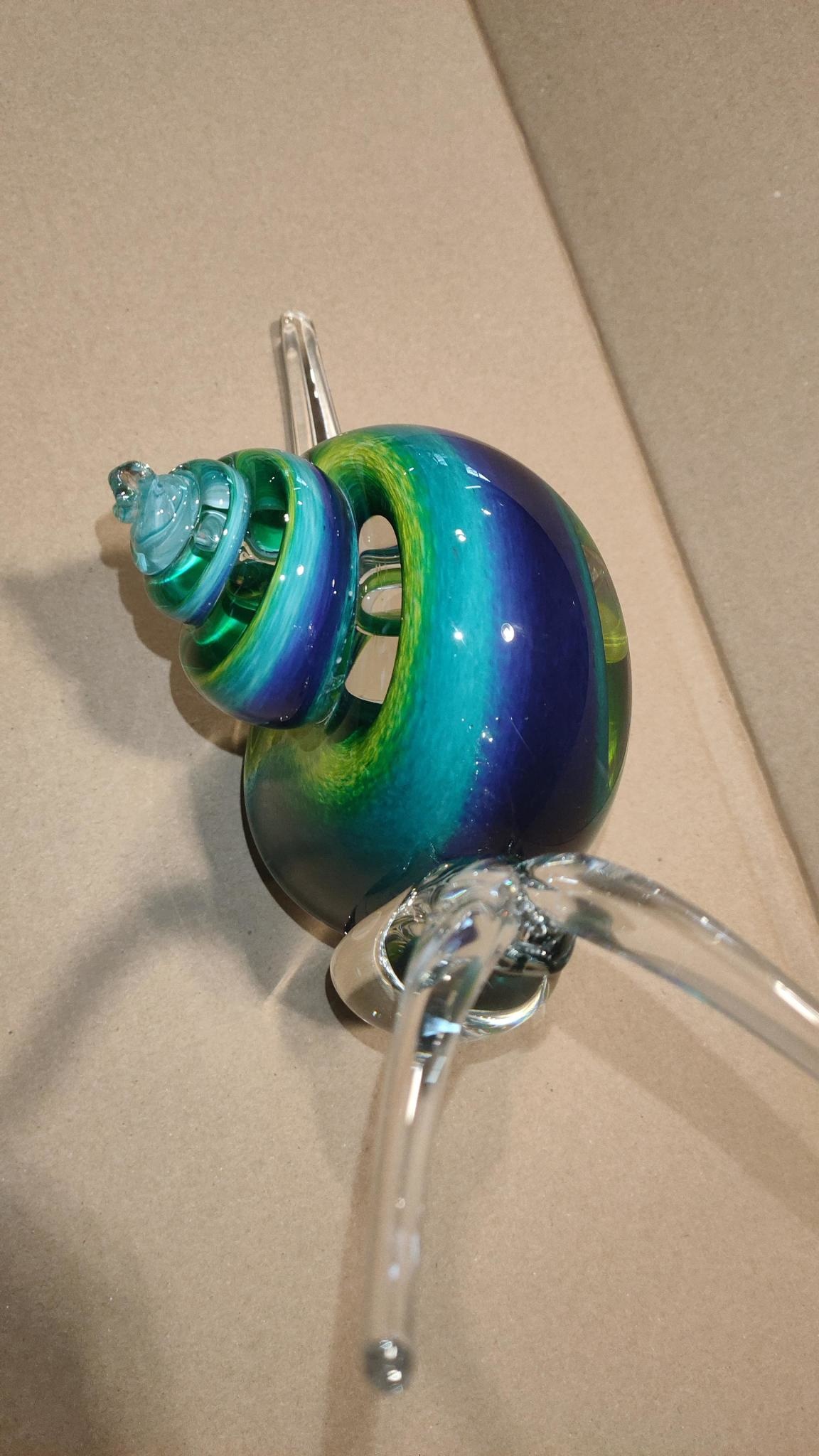 Dan kan dit handgemaakte glazen blauw-groene slak U wellicht interesseren.