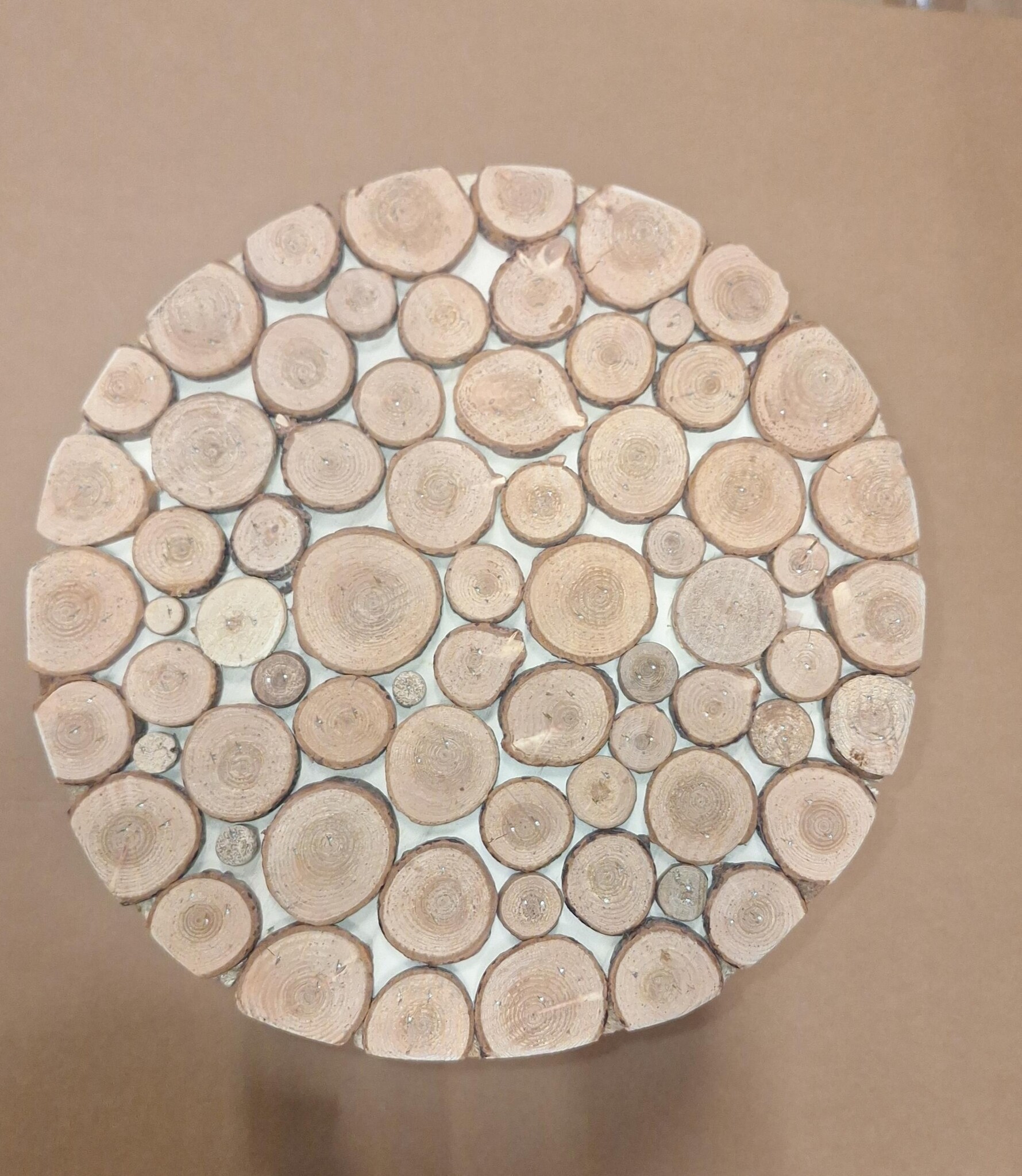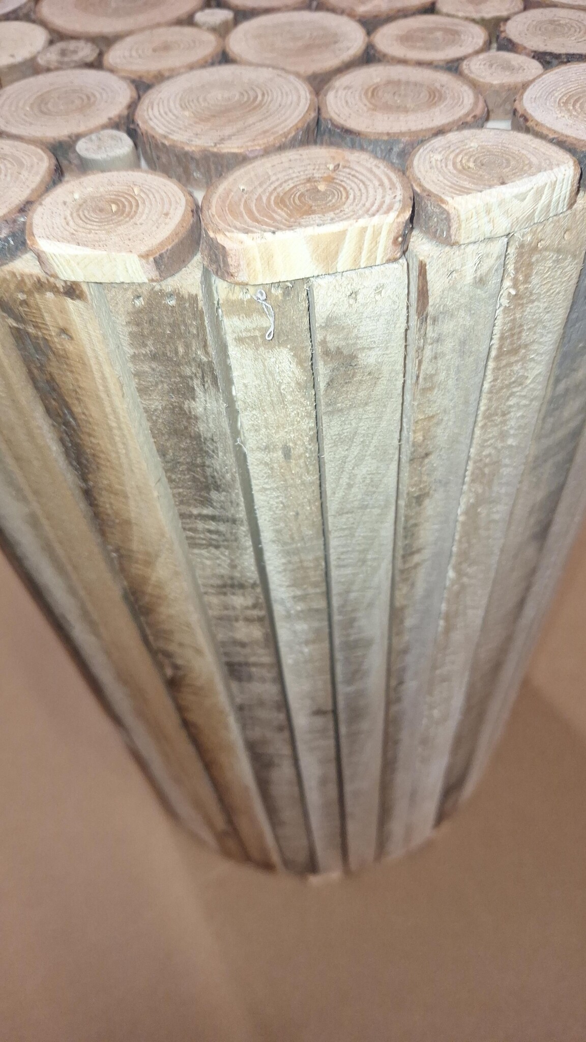 Gemaakt van 1,5 cm dikke latjes, boven en onder dichtgemaakt met ronde schijfjes. Mooi in combinatie met een beeld, pot, enz.