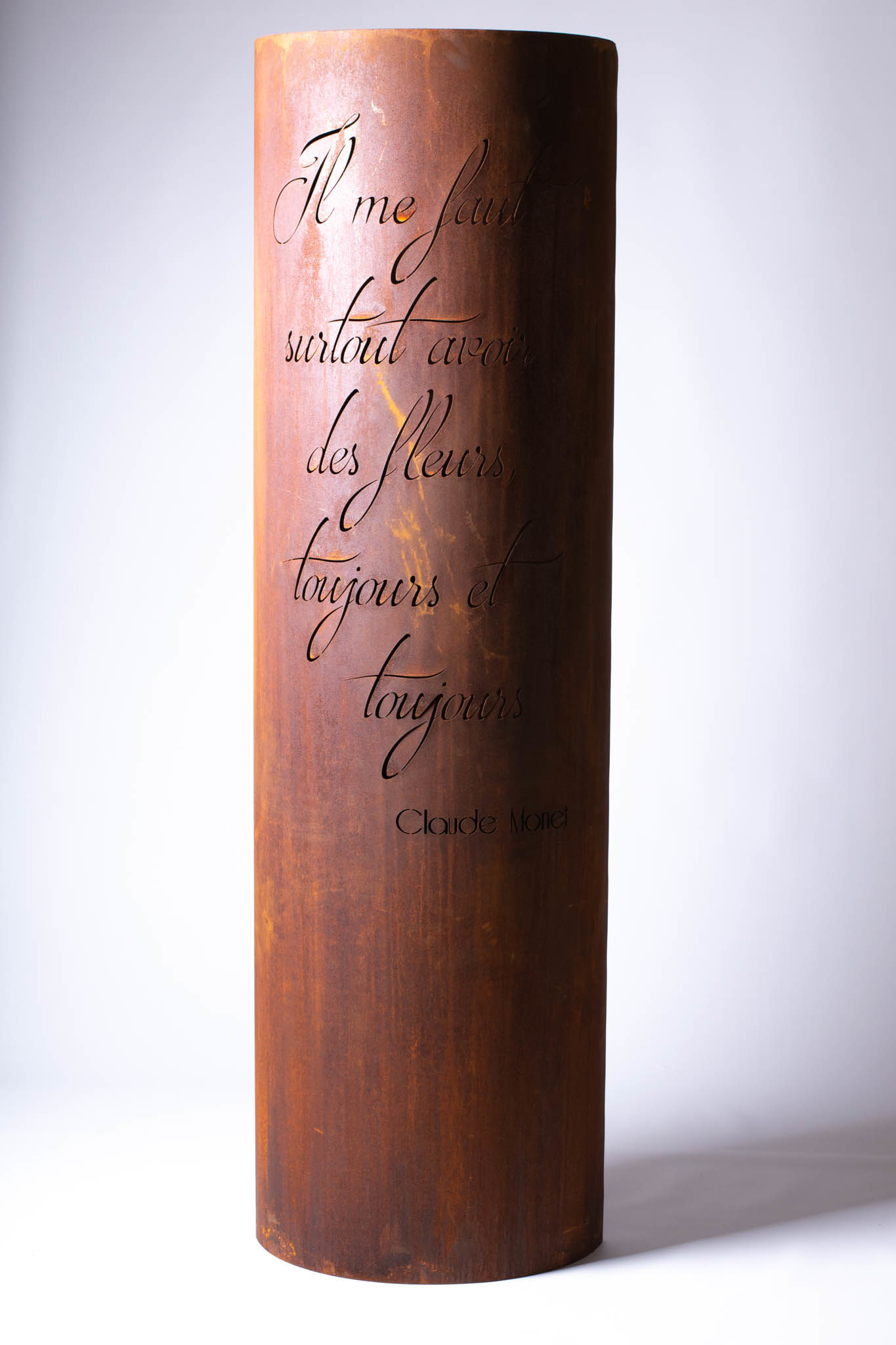 Een aparte sfeermaker in uw tuin, Zo kun je deze sfeerlamp in de vorm van een halfronde zuil toch wel noemen. In deze sokkel is een beroemd citaat van de kunstschilder Monet gelaserd, tw ” il me faut surtout avoir des fleurs, toujours et toujours” waardoor in het donker warmwit licht schijnt. Deze kolom is gemaakt van 2mm dik onbehandeld ijzer, wat een prachtige en tijdloze (roest)bruine kleur geeft.