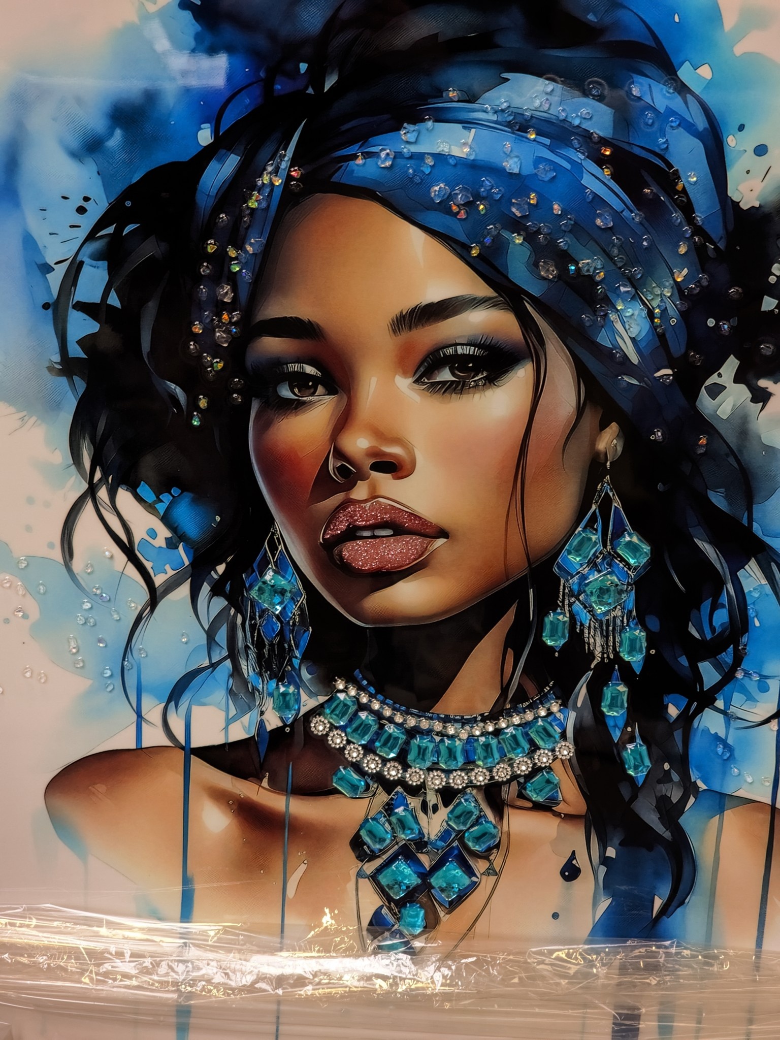 Tenslotte wordt er een dunne uv bestendige folie over heel het doek gespannen, waarna de folie vacuüm gezogen wordt. Resultaat is dan een prachtig zijdeglans schilderij waarbij de strass steentjes voor de hippe maar ook elegante uitstraling zorgt