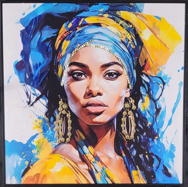 Bent u op zoek naar een hyper modern canvas schilderij met verschillende strass accenten? Dan is dit model schilderij met een prachtige dame met hoofddoek zeker iets voor u. Dit vierkante canvas schilderij heeft zeer mooie accenten met steentjes op de sieraden van de vrouw, is zorgvuldig gemaakt met de mooiste kleurcomposities en met veel aandacht voor de finishing touch!