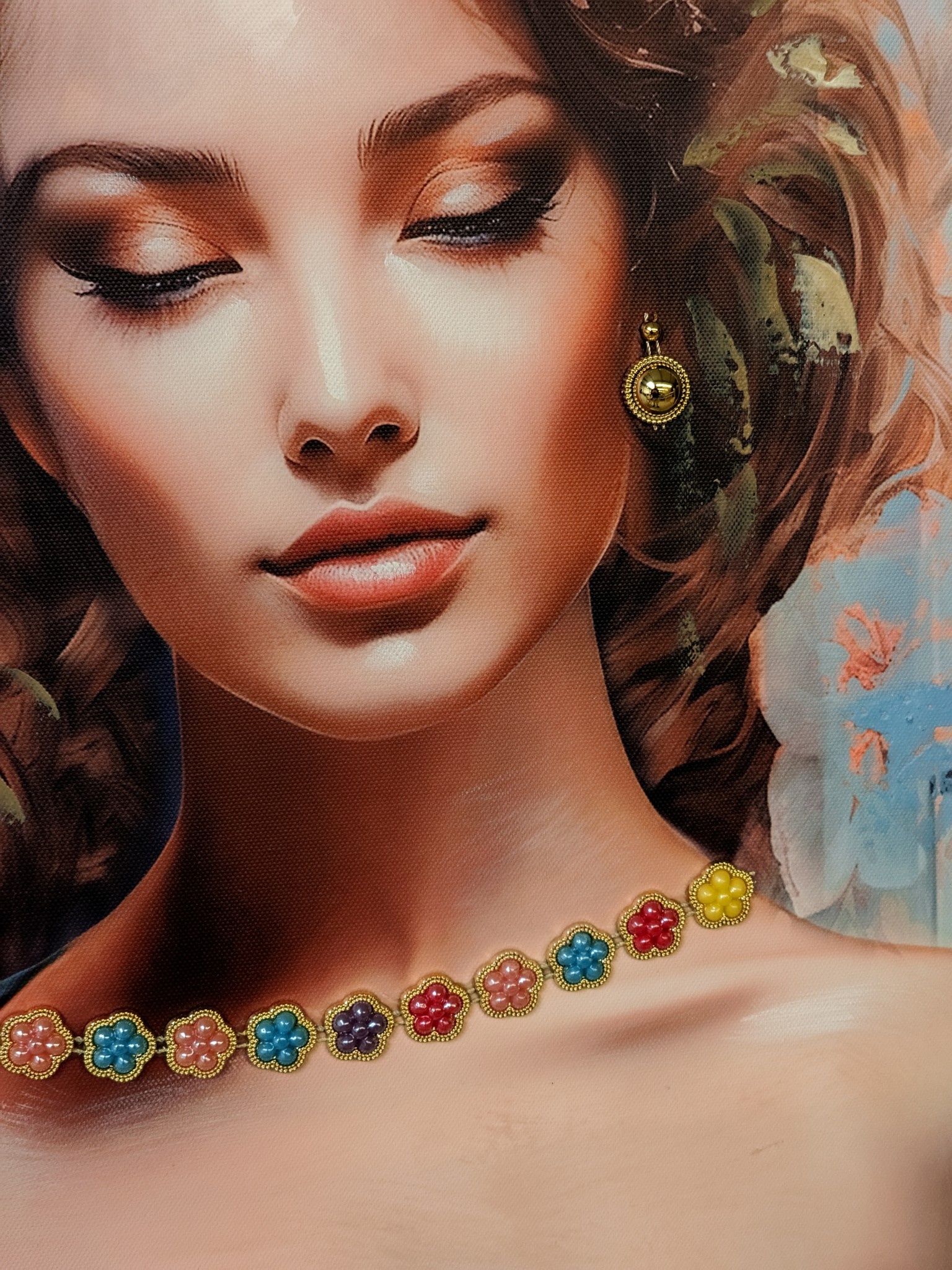 Dit canvas schilderij heeft een zeer modern procédé ondergaan tijdens de productie. Het canvas wordt geprint, dan worden alle steentjes op het doek gelijmd. Het schilderij wordt verder afgewerkt met aqrylverf.