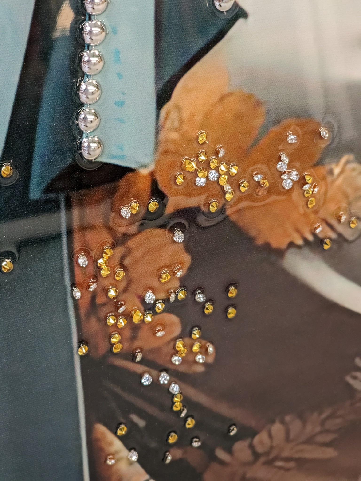Tenslotte wordt er een dunne uv bestendige folie over heel het doek gespannen, waarna de folie vacuüm gezogen wordt. Resultaat is dan een prachtig zijdeglans schilderij waarbij de strass steentjes voor de hippe maar ook elegante uitstraling zorgt