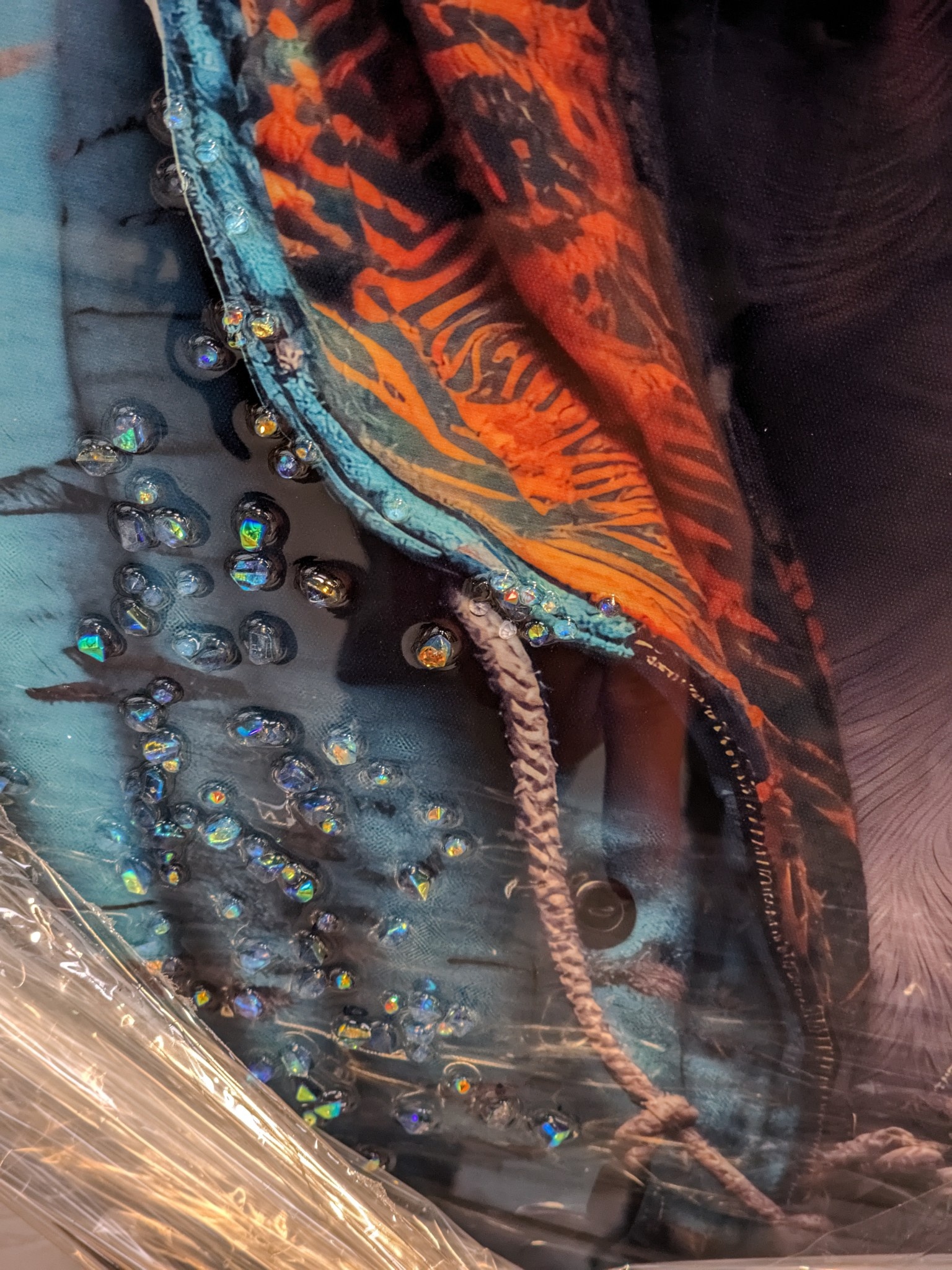 Tenslotte wordt er een dunne uv bestendige folie over heel het doek gespannen, waarna de folie vacuüm gezogen wordt. Resultaat is dan een prachtig zijdeglans schilderij waarbij de strass steentjes voor de hippe maar ook elegante uitstraling zorgt