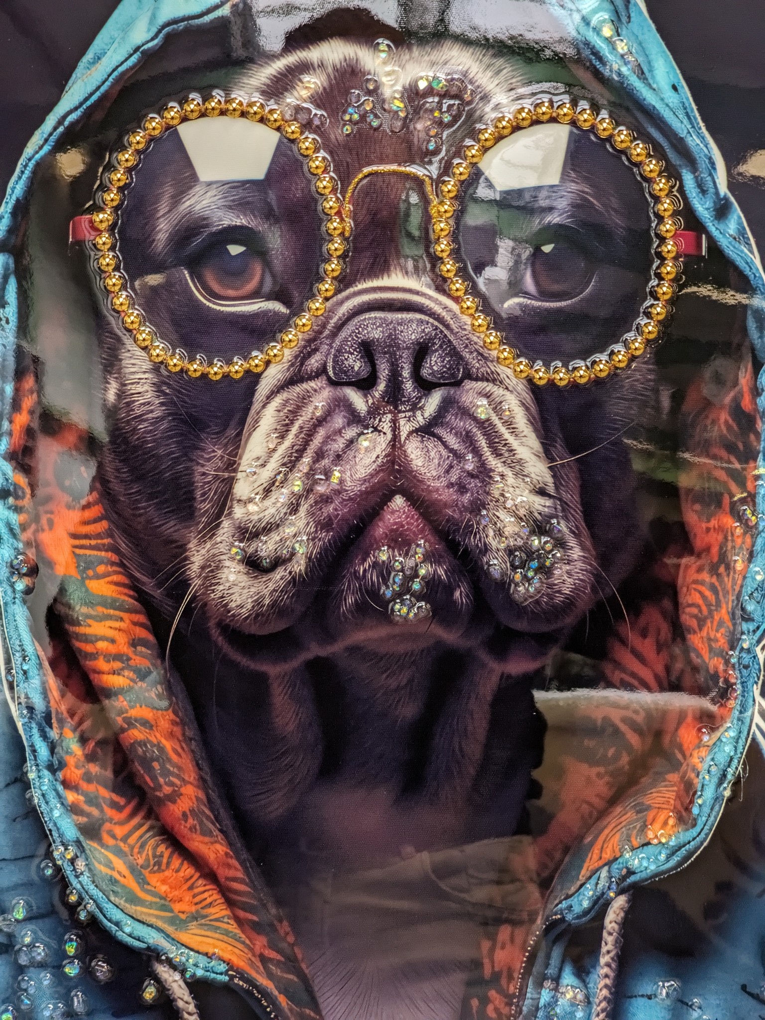 Bent u op zoek naar een hyper modern canvas schilderij met verschillende strass accenten? Dan is dit model schilderij met een aangeklede bulldog met bril zeker iets voor u. Dit hoge canvas schilderij heeft zeer mooie accenten met steentjes op de bril, is zorgvuldig gemaakt met de mooiste kleurcomposities en met veel aandacht voor de finishing touch!