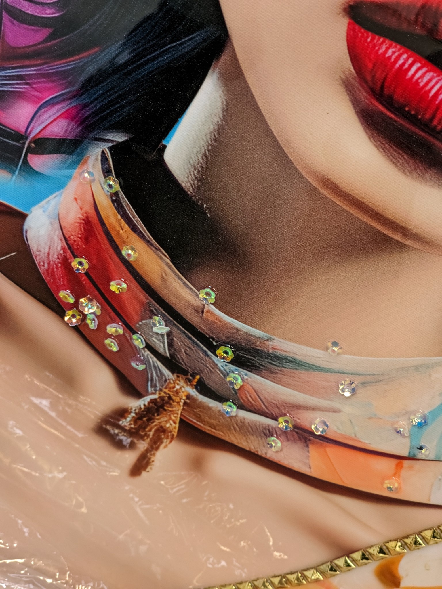 Tenslotte wordt er een dunne uv bestendige folie over heel het doek gespannen, waarna de folie vacuüm gezogen wordt. Resultaat is dan een prachtig zijdeglans schilderij waarbij de strass steentjes voor de hippe maar ook elegante uitstraling zorgt