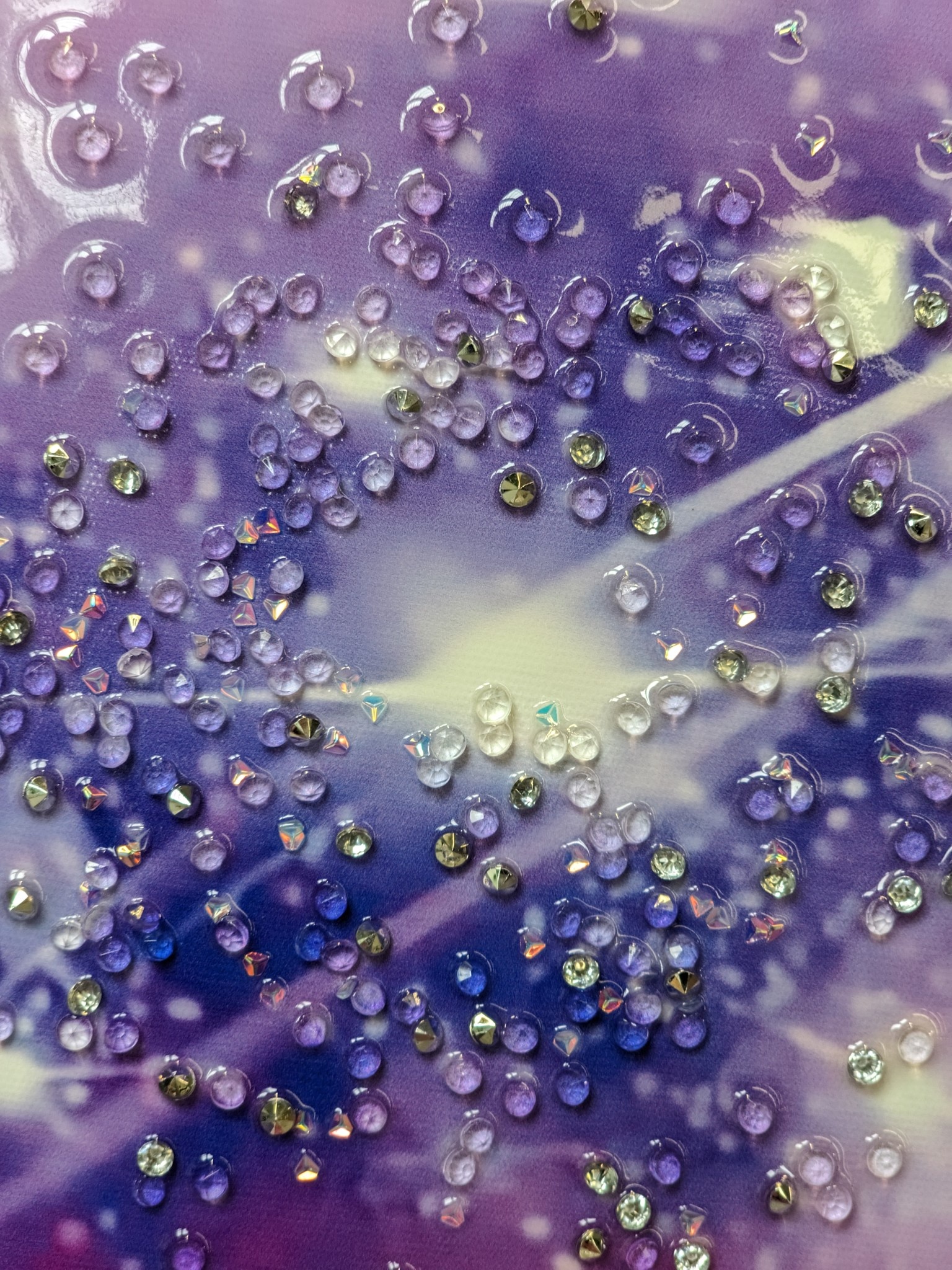 Tenslotte wordt er een dunne uv bestendige folie over heel het doek gespannen, waarna de folie vacuüm gezogen wordt. Resultaat is dan een prachtig zijdeglans schilderij waarbij de strass steentjes voor de hippe maar ook elegante uitstraling zorgt
