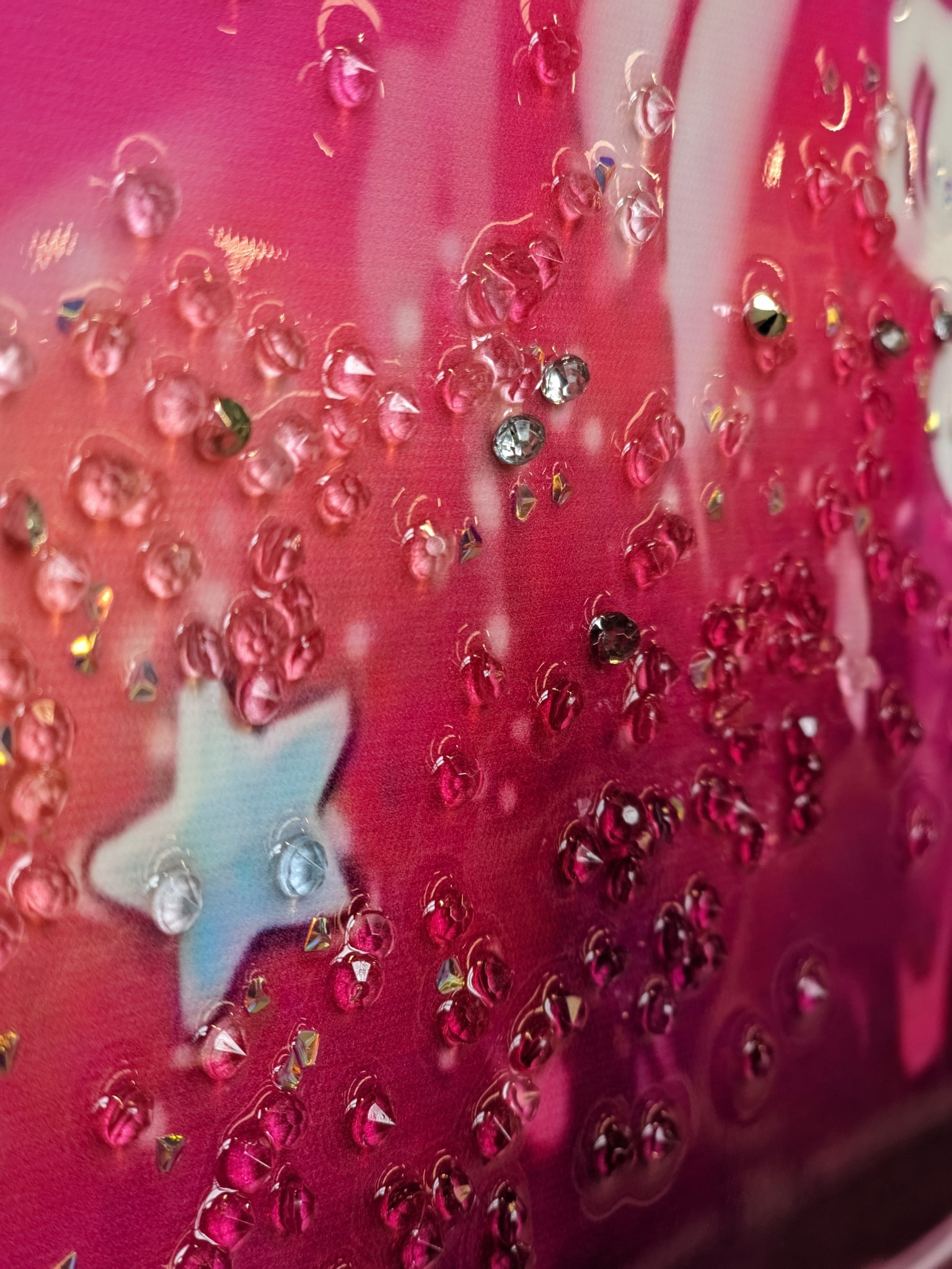 Dit canvas schilderij heeft een zeer modern procédé ondergaan tijdens de productie. Het canvas wordt geprint, dan worden alle steentjes op het doek gelijmd. Het schilderij wordt verder afgewerkt met aqrylverf.