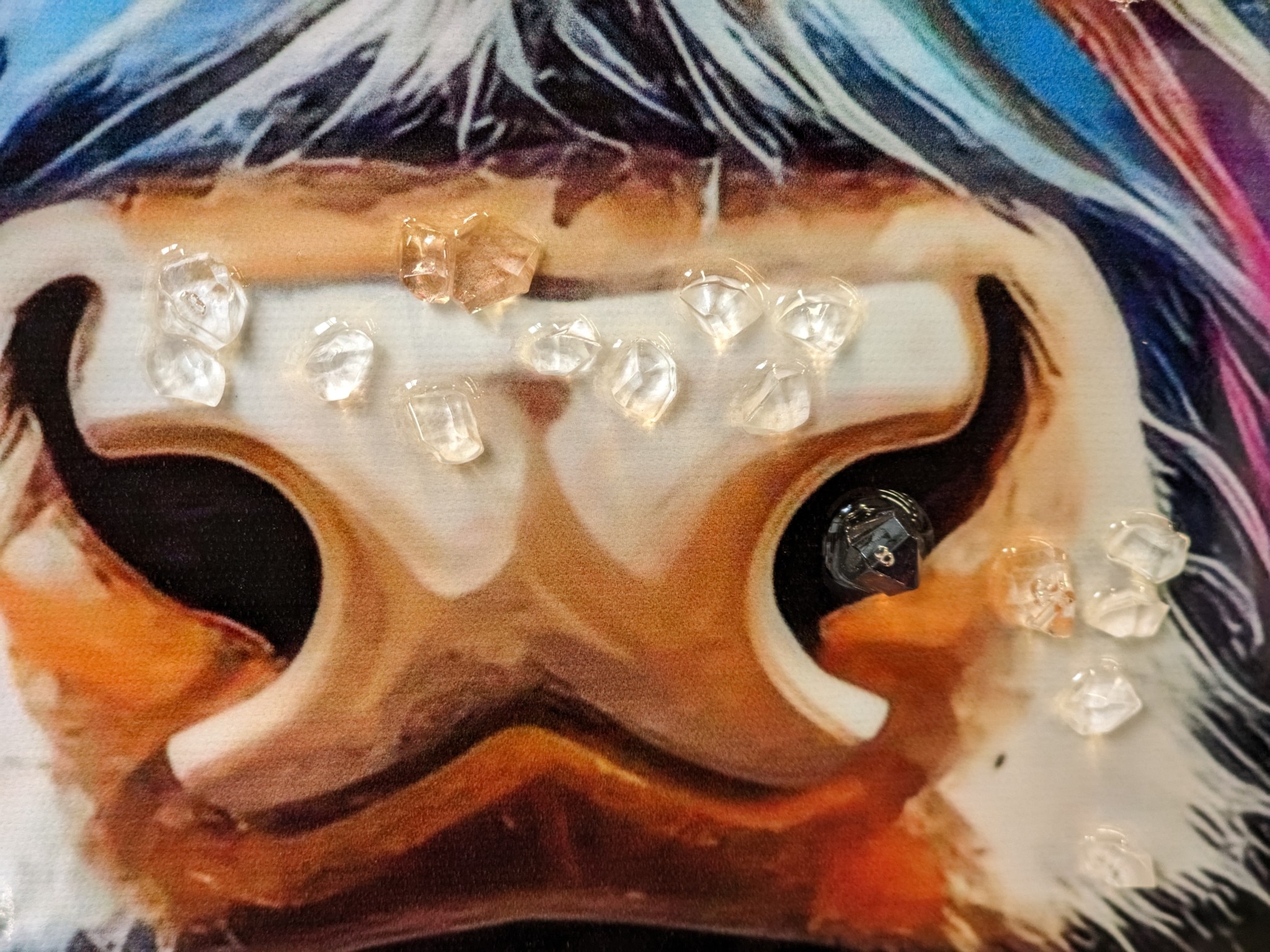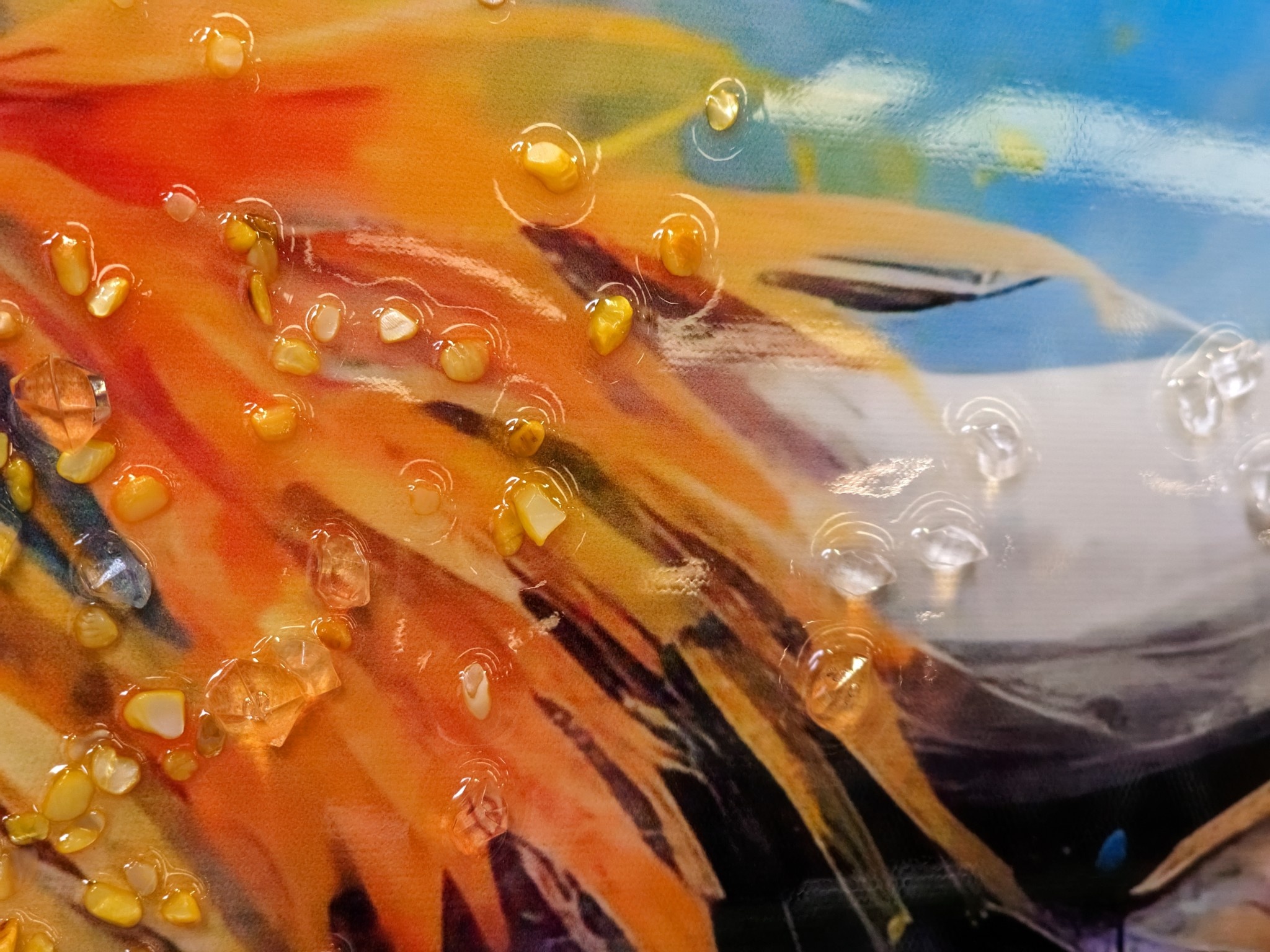 Dit canvas schilderij heeft een zeer modern procédé ondergaan tijdens de productie. Het canvas wordt geprint, dan worden alle steentjes op het doek gelijmd. Het schilderij wordt verder afgewerkt met aqrylverf.
