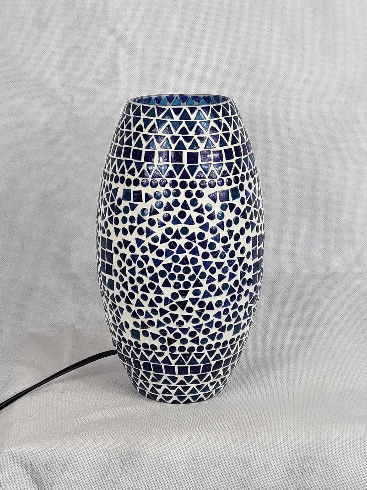 Sfeerlamp van glas. Prachtig handgemaakte mozaïek lamp, smalle vorm. Elk blauw glassteentje is handmatig op het onderliggende glas opgebracht. In het donker geeft deze tafellamp een prachtig lichteffect zodra het licht door het mozaïek schijnt. De smalle, hoge vorm zorgt ervoor dat deze lamp ook kan staan op smallere ondergronden zoals vensterbanken, planken ed.