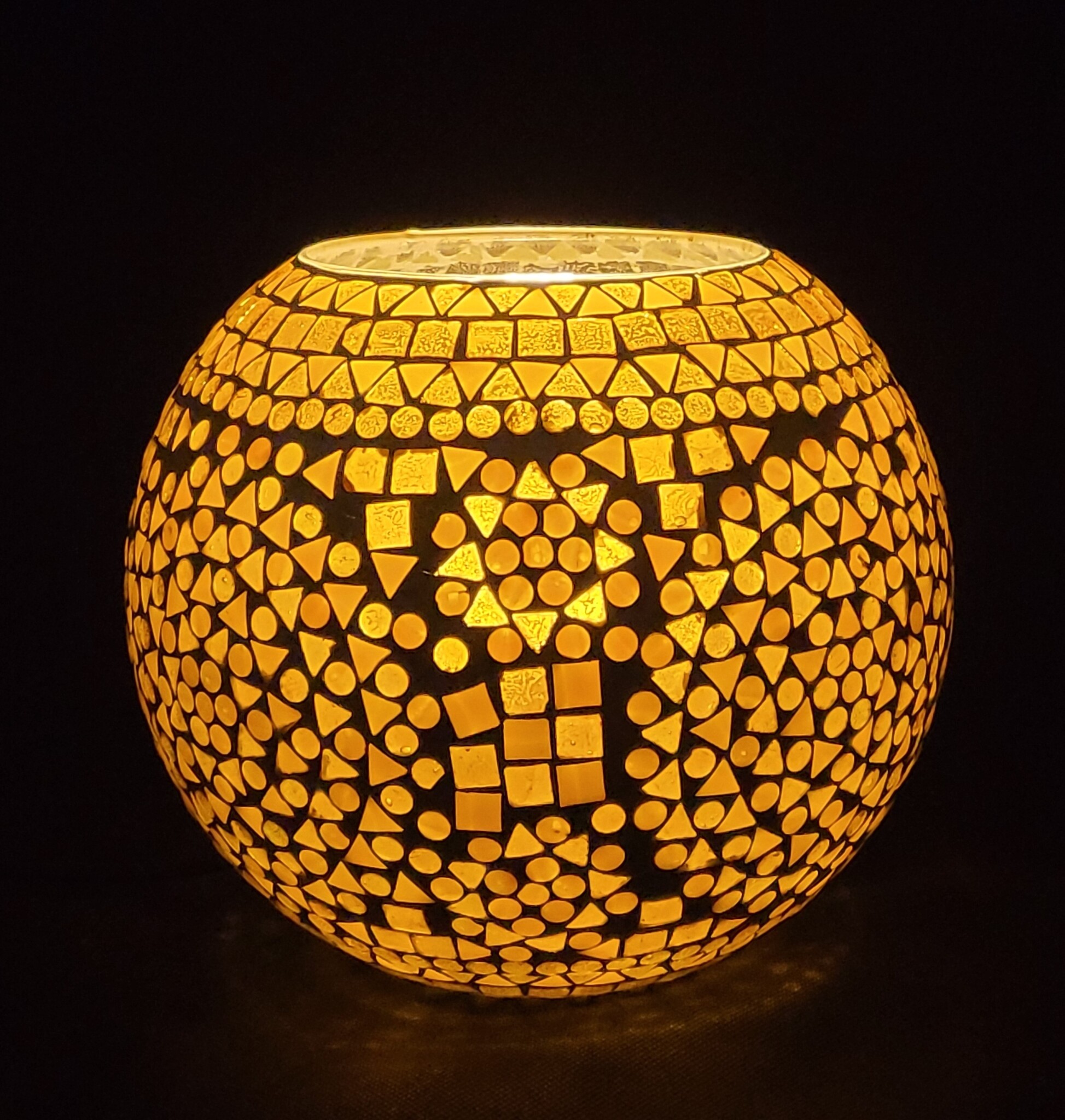 Sfeerlamp van glas. Prachtig handgemaakte mozaïek lamp, in ronde bol vorm. Elk geel/bruin gekleurd glassteentje is handmatig op het onderliggende glas opgebracht. In het donker geeft deze tafellamp een prachtig lichteffect zodra het licht door het mozaïek schijnt. De ronde bol vorm zorgt ervoor dat deze lamp ook kan staan op smallere ondergronden zoals vensterbanken, planken ed.