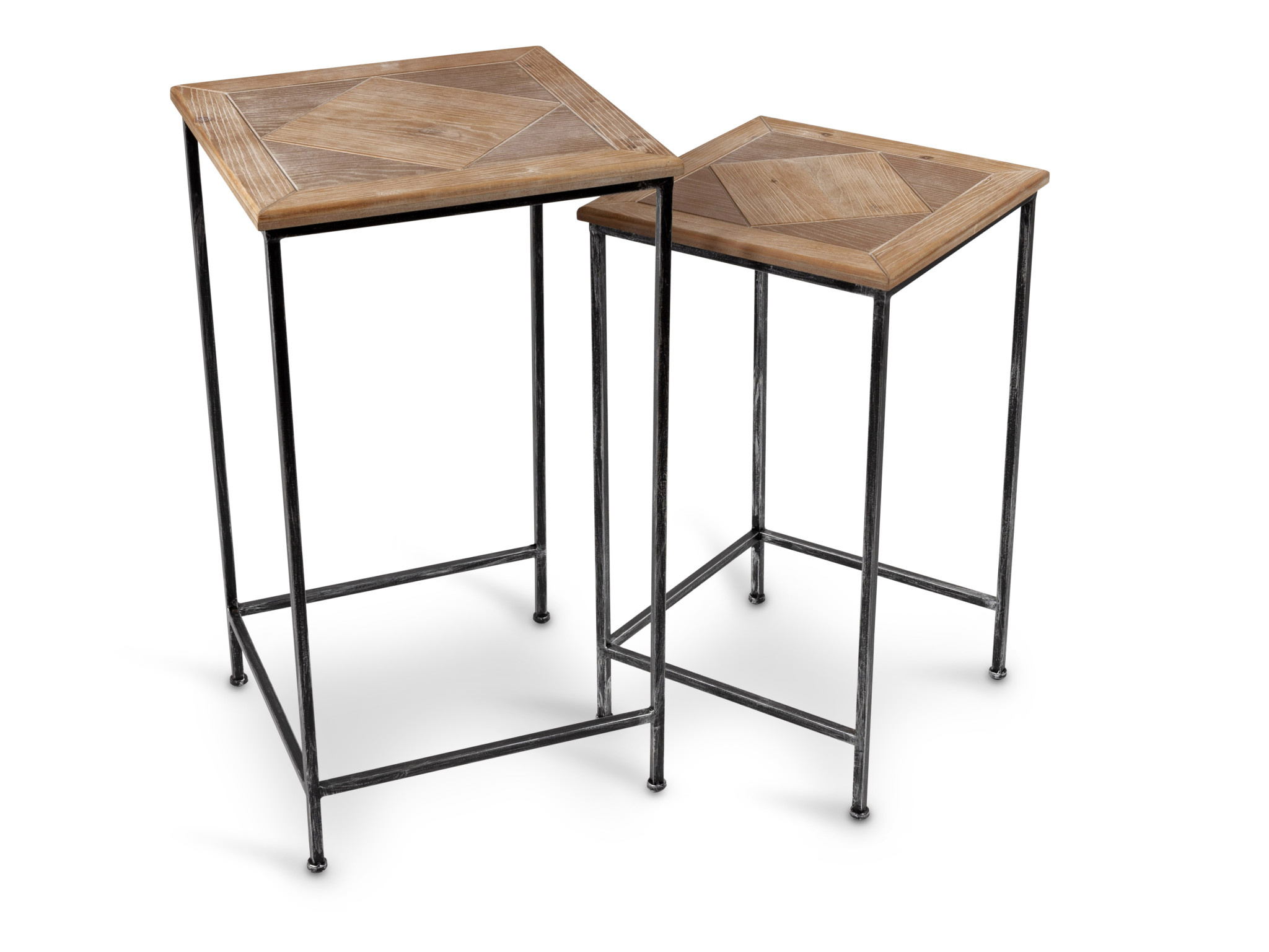 Haal pure schoonheid in uw huis of tuin met deze moderne vierkante bijzettafel setje in industrieële stijl, met landelijk ogende houten bladen. Deze industrieële tafelset is 2 delig, en kan in elkaar geschoven worden.