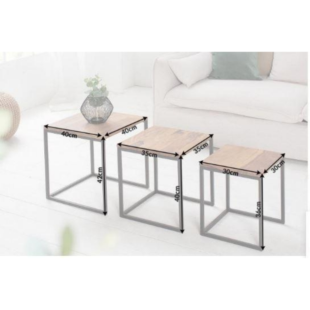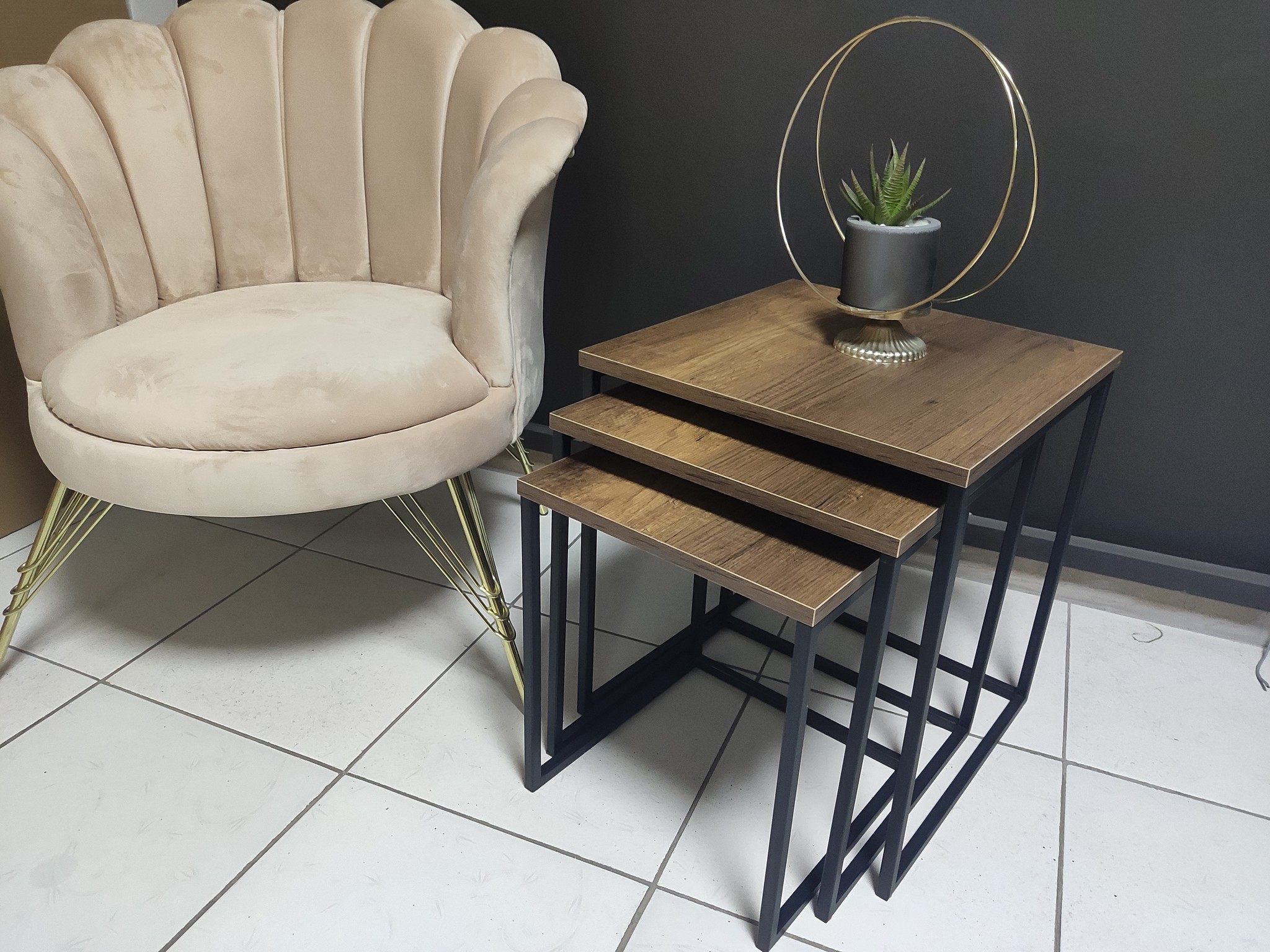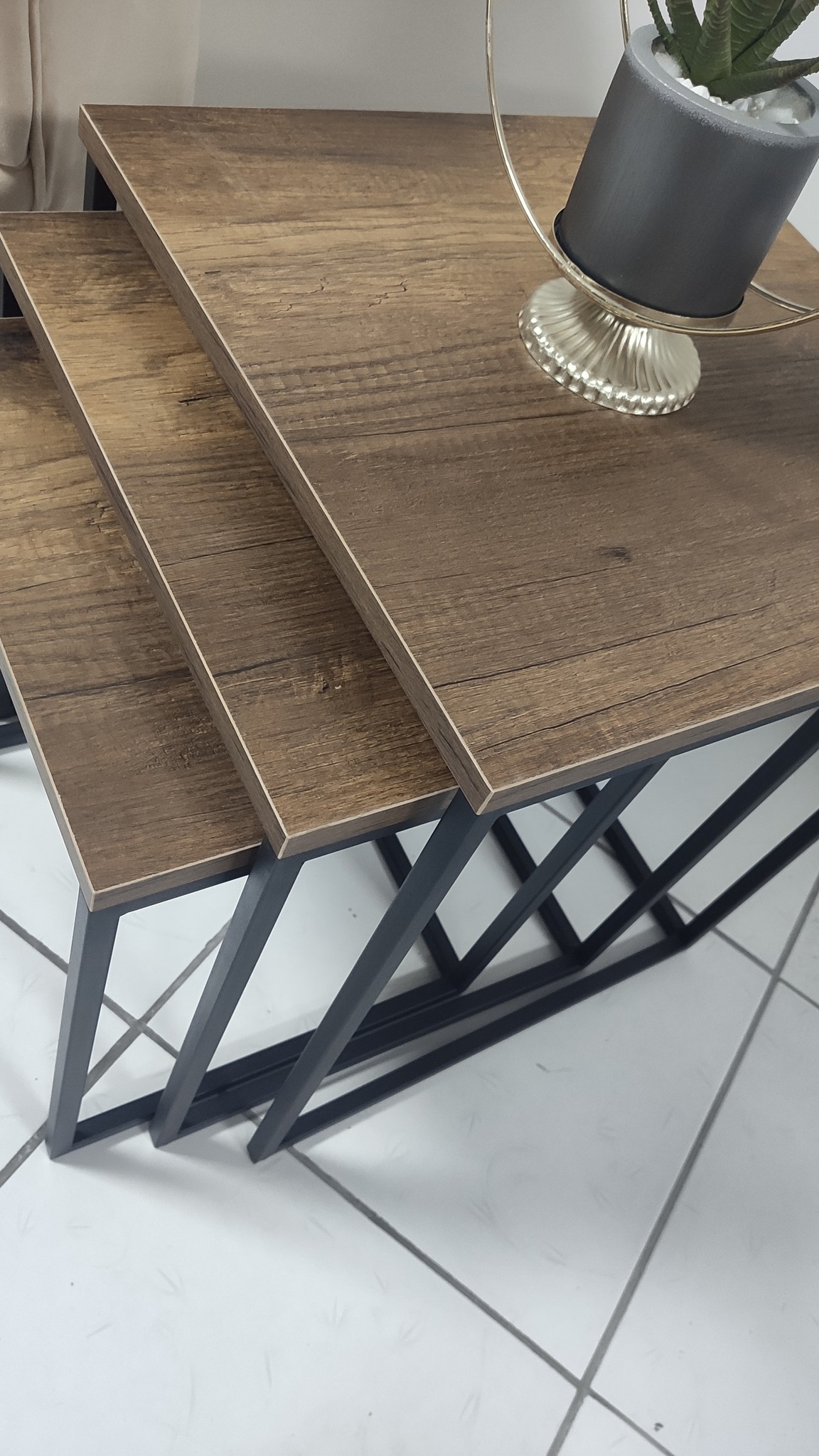 Deze tafelset is rubuust gemaakt met de beste materialen. De bladen zijn van hoge kwaliteit 18 mm dikke mdf in eikenhout print, en is voor vele toepassingen inzetbaar; een plant, beeld, vaas, het staat er allemaal prachtig op, maar deze 3-delige tafelset is ook een makkelijk bij-de-handje en wordt vaak gebruikt voor vele toepassingen. Alles is netjes aan elkaar gelast, en daarna geslepen tot een zeer strak geheel.