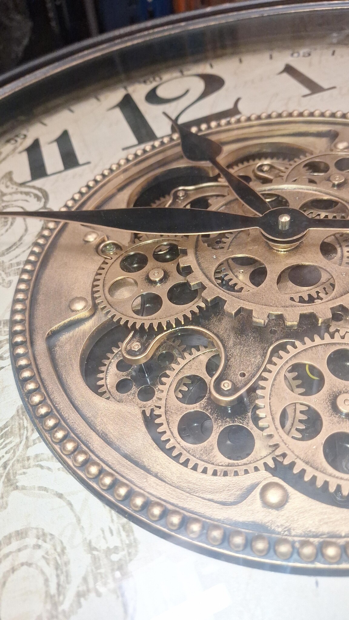 Het wordt een feest om nu te kijken hoe laat het is, met deze mooie open ronde koffiekleurige muurklok met bewegende delen. Deze zeer mooie ronde klok heeft een stalen frame in een oud koffiebruine kleur, met grote cijfers.