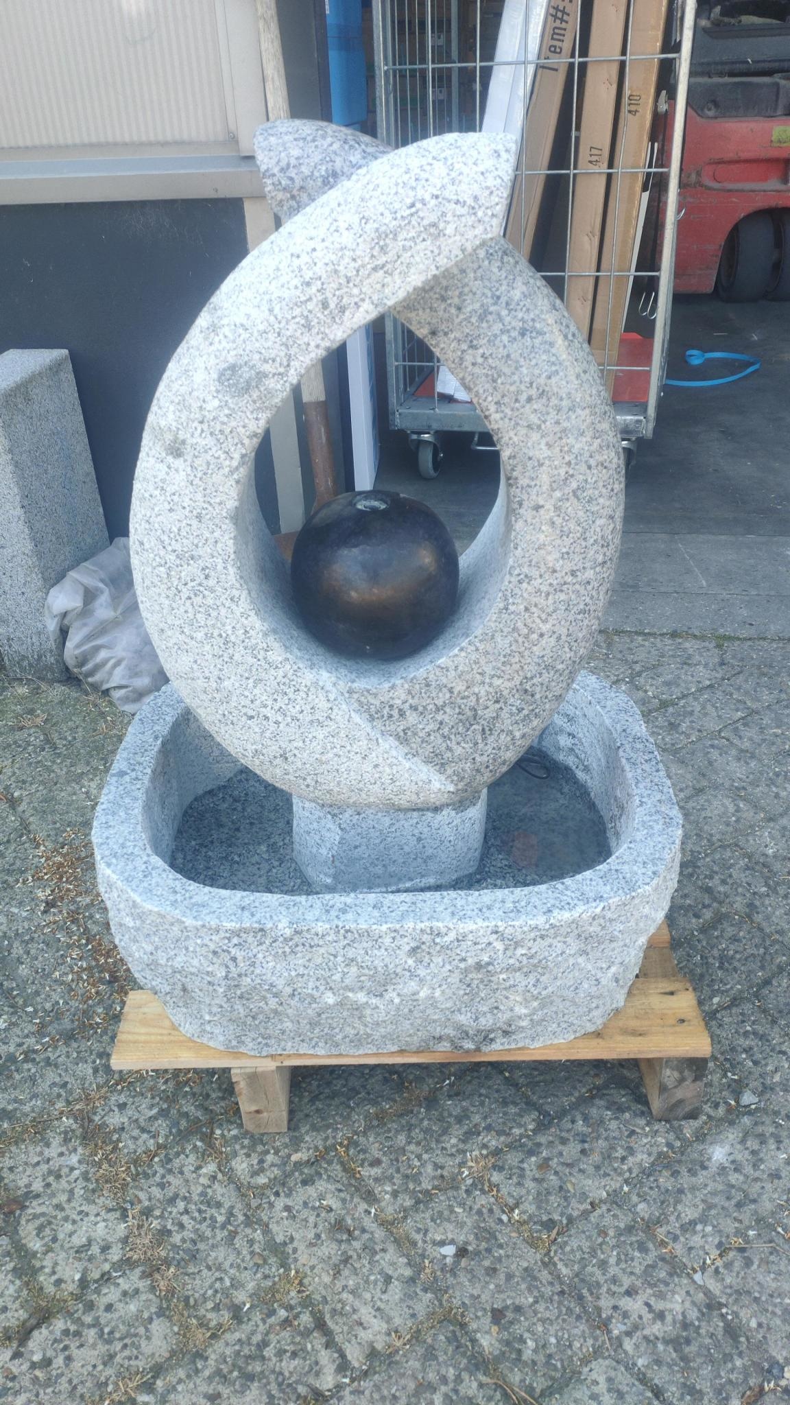 Waterornament is gemaakt van massief grijs graniet met led verlichting. Hoogte 80 cm, bak opp is 50x60cm. Wordt compleet geleverd met pomp, slangen en ledverlichting bovenin de bol. Behoeft geen graafwerk, de bak is tevens de watervoorraad.