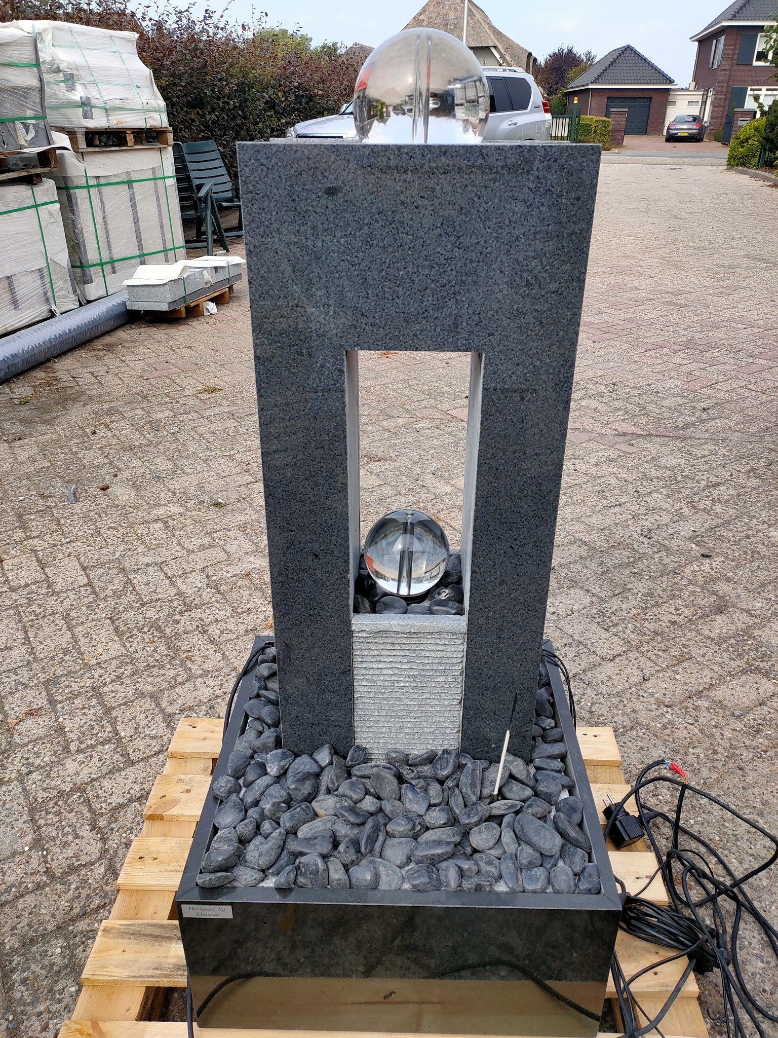 Een prachtig strakke fontein voor in uw tuin of op het terras, in eigen beheer ontwikkeld en nergens anders te koop. De waterbak is gemaakt van effen pikzwart gepolijst graniet, in de hoeken onder 45graden gezaagd, de waterzuil is van grijs gepolijst graniet die deels ingezaagd zijn, voor een zeer mooie schittering op het reliëf, zeker in het donker wanneer er een spot op gericht wordt.