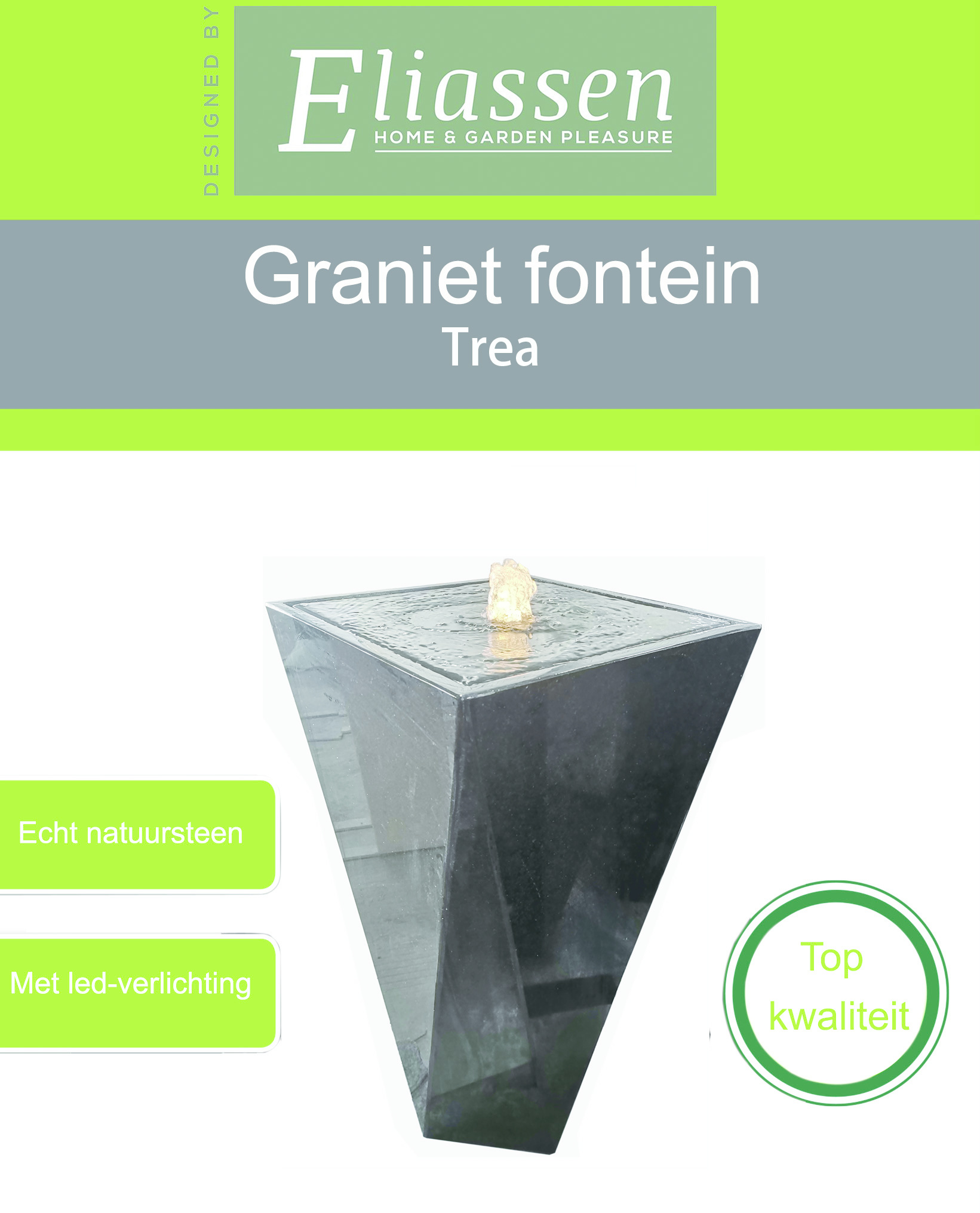 Bent u op zoek naar een fontein voor in uw tuin? Deze terrasfontein van graniet genaamd Trea biedt u de mooie uitstraling in een compleet pakket. Waterornamenten zijn er in verschillende vormen en maten, dit model is een terrasfontein dus dat betekent dat u niet in uw tuin hoeft te graven.