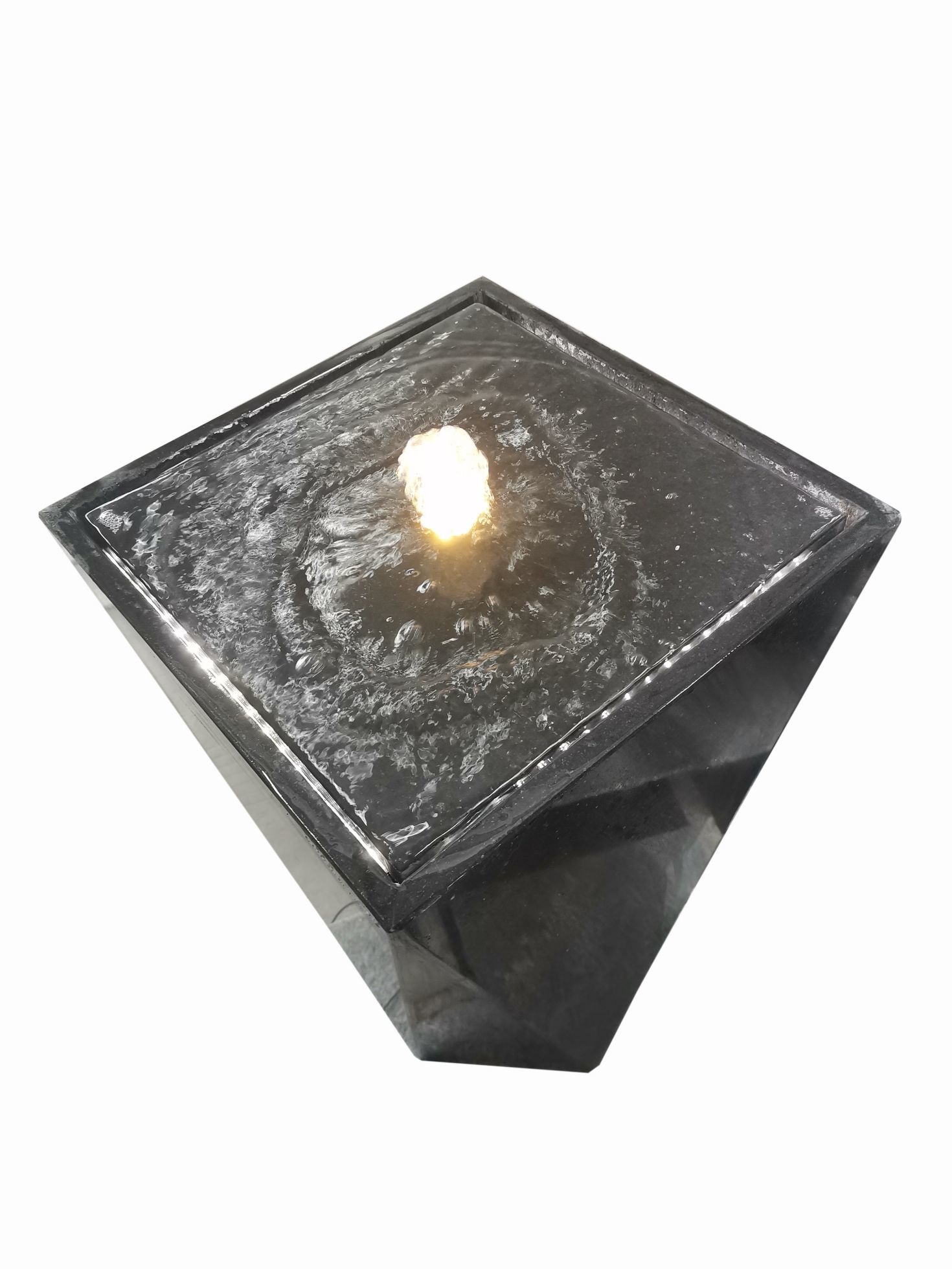 Het water stroomt uit het vierkant bovenop wat een zeer mooi speels effect geeft. Bij dit model is aan 4 zijden de waterloop te zien, dmv ledstrips aan de onderkant, Voor dit model is geen graafwerk nodig, omdat de watervoorraad zich in de zuil bevindt. Wordt compleet geleverd met pomp, slang, leds, gebruiksaanwijzing. Voor een complete werking heeft u 2 stopcontacten nodig.