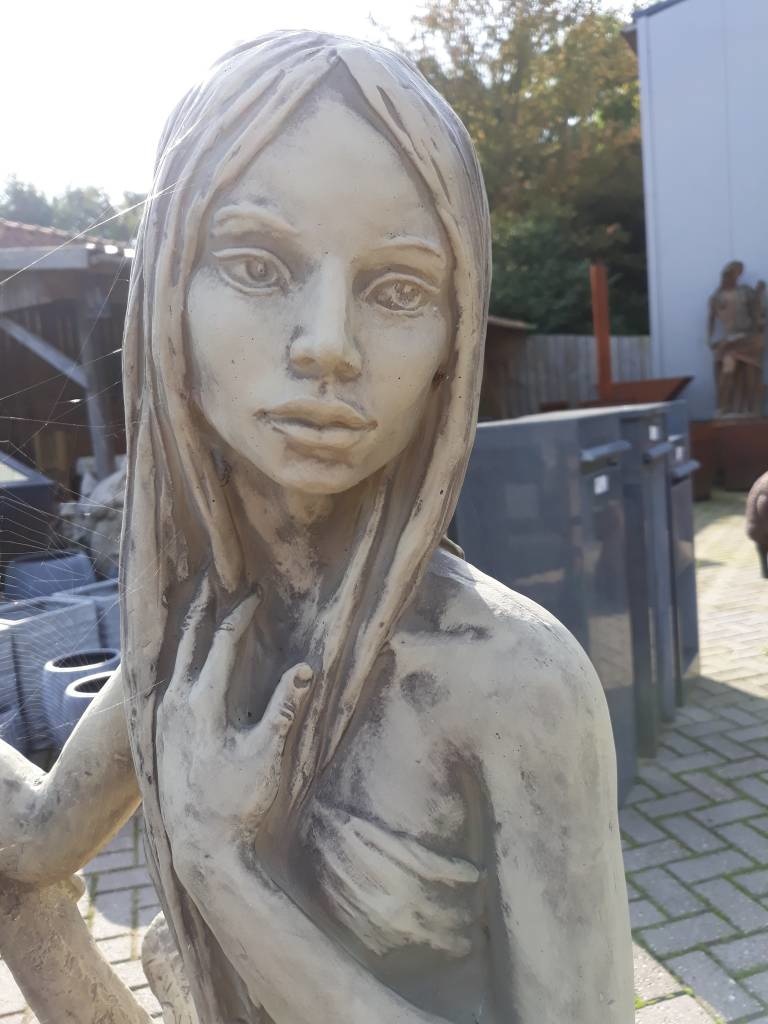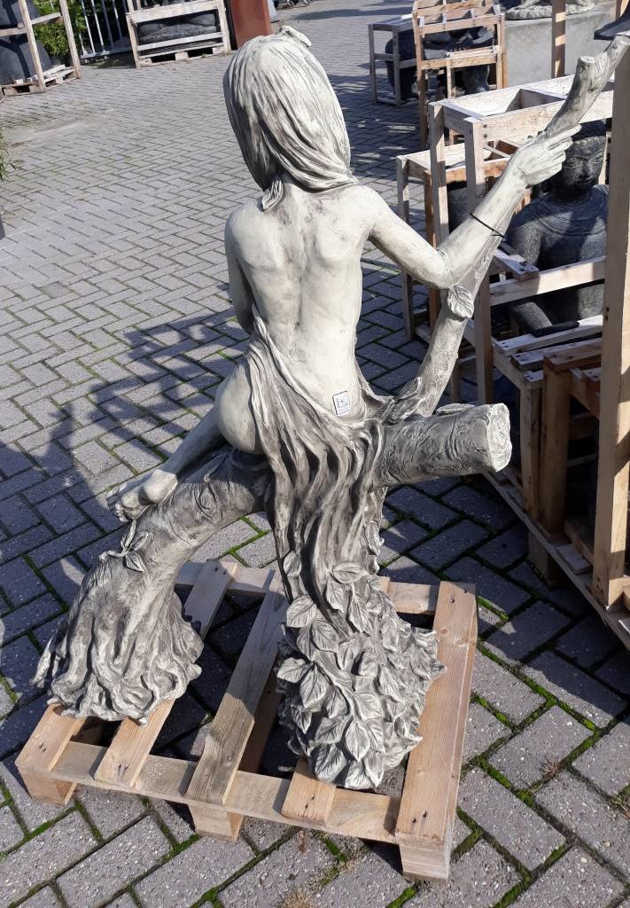 Prachtig gevormde tuinbeeld Bosnimf, zittend op boomstronk. Dit model tuinbeeld zal in uw tuin uw juiste sfeer weergeven. Dit betonnen beeld is gemaakt met zeer hoge kwaliteit gietsteen, waar u jarenlang plezier van zult beleven. Dit is een beschermd model, namaak is streng verboden. We hebben nagenoeg deze hele serie tuinbeelden ook in onze showroom, waar u van harte welkom bent.
