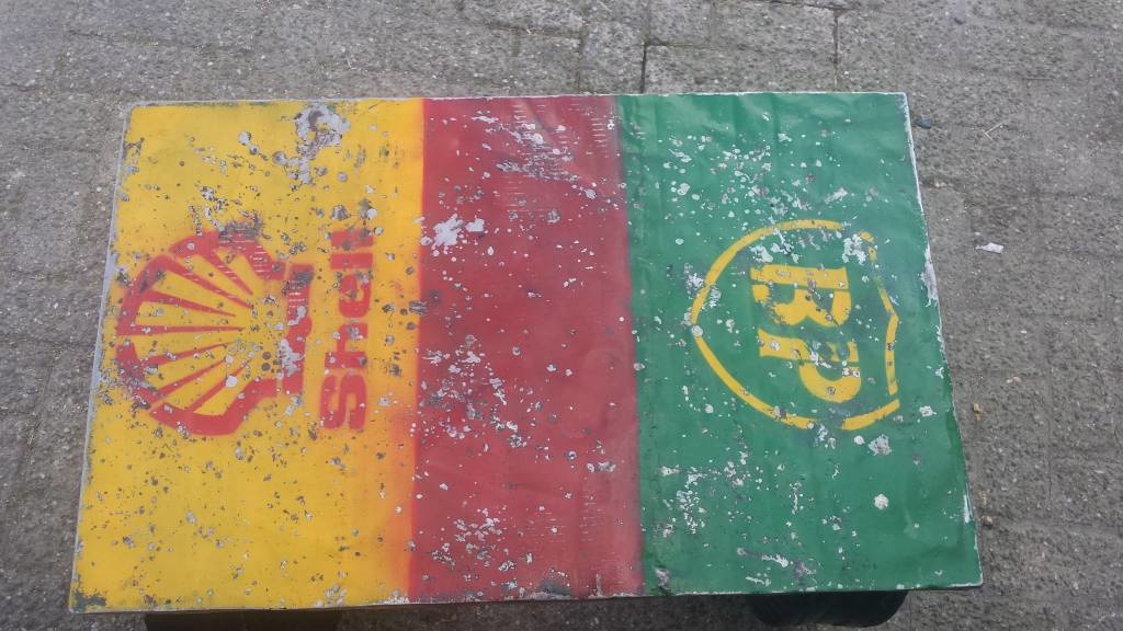 Dit setje bestaat uit 2 stoelen en een tafel en is gemaakt van gebruikte autobanden en olievaten/drums ! De banden zijn gecoat zodat deze niet meer afgeven. De stoelen hebben een onverwacht goede verende zit, het zitvlak is met gebruikt rubber uit banden geweven tot een soepel zitvlak. Onderstel en rug van de stoelen is van hout. Beschermdopjes voor uw vleor zijn aangebracht. Opp van de tafel is Ca 80x60cm