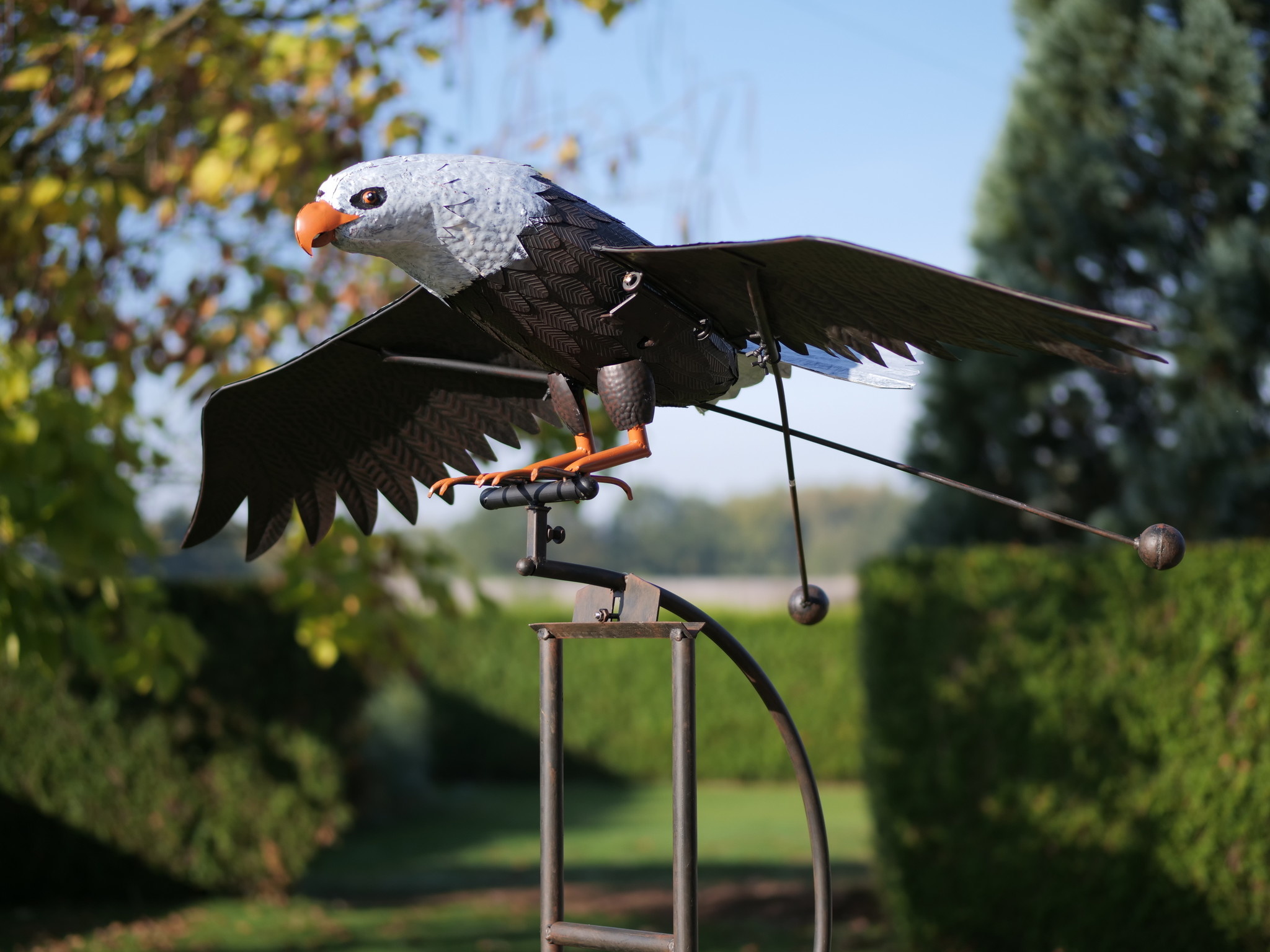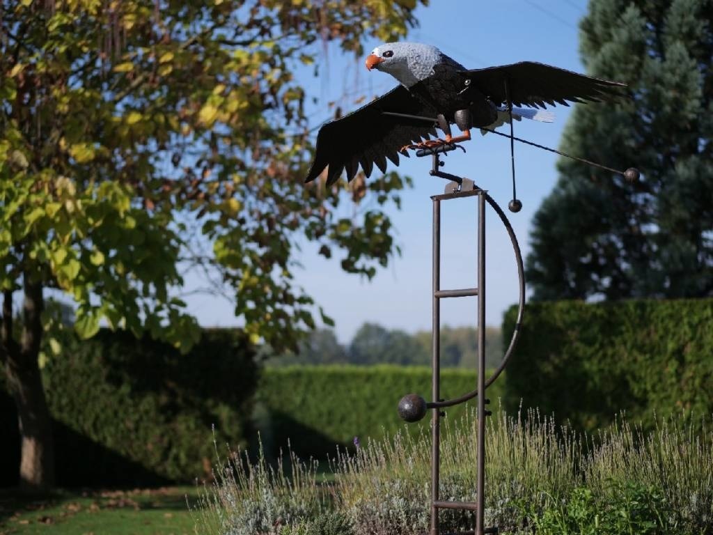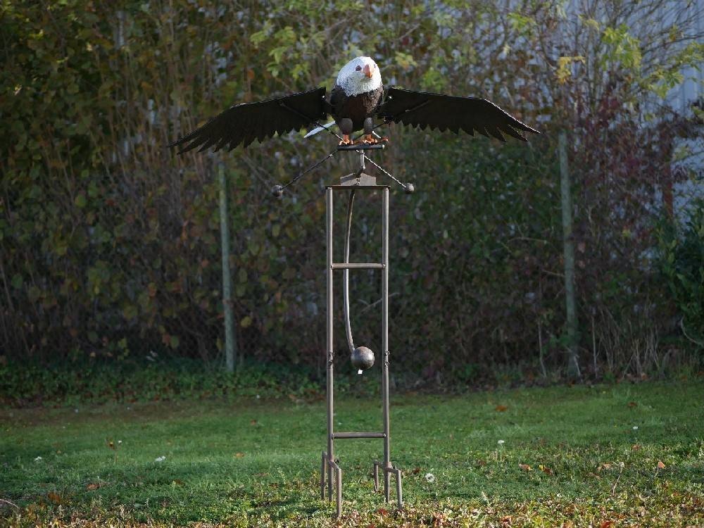 Supergroot is dit stuk tuindecoratie. Deze grote arend maakt vliegbewegingen met de vleugels dmv de wind en balansgewichten aan de vleugels en staart. Bij stevige wind vliegt dit model arend eindeloos op een neer.Contragewichten in de vorm van metalen ballen. Helemaal met de hand vervaardigd van ijzer.