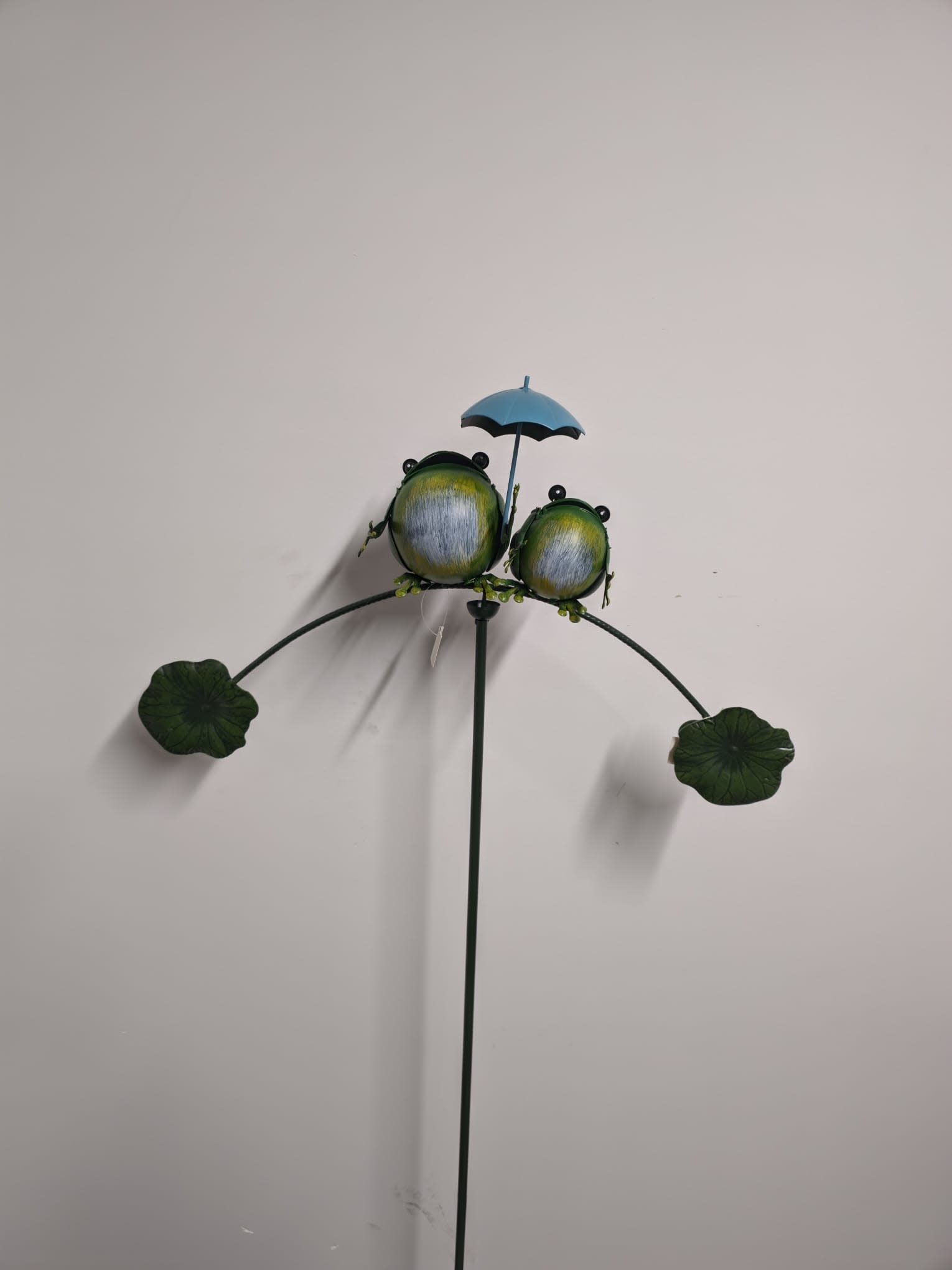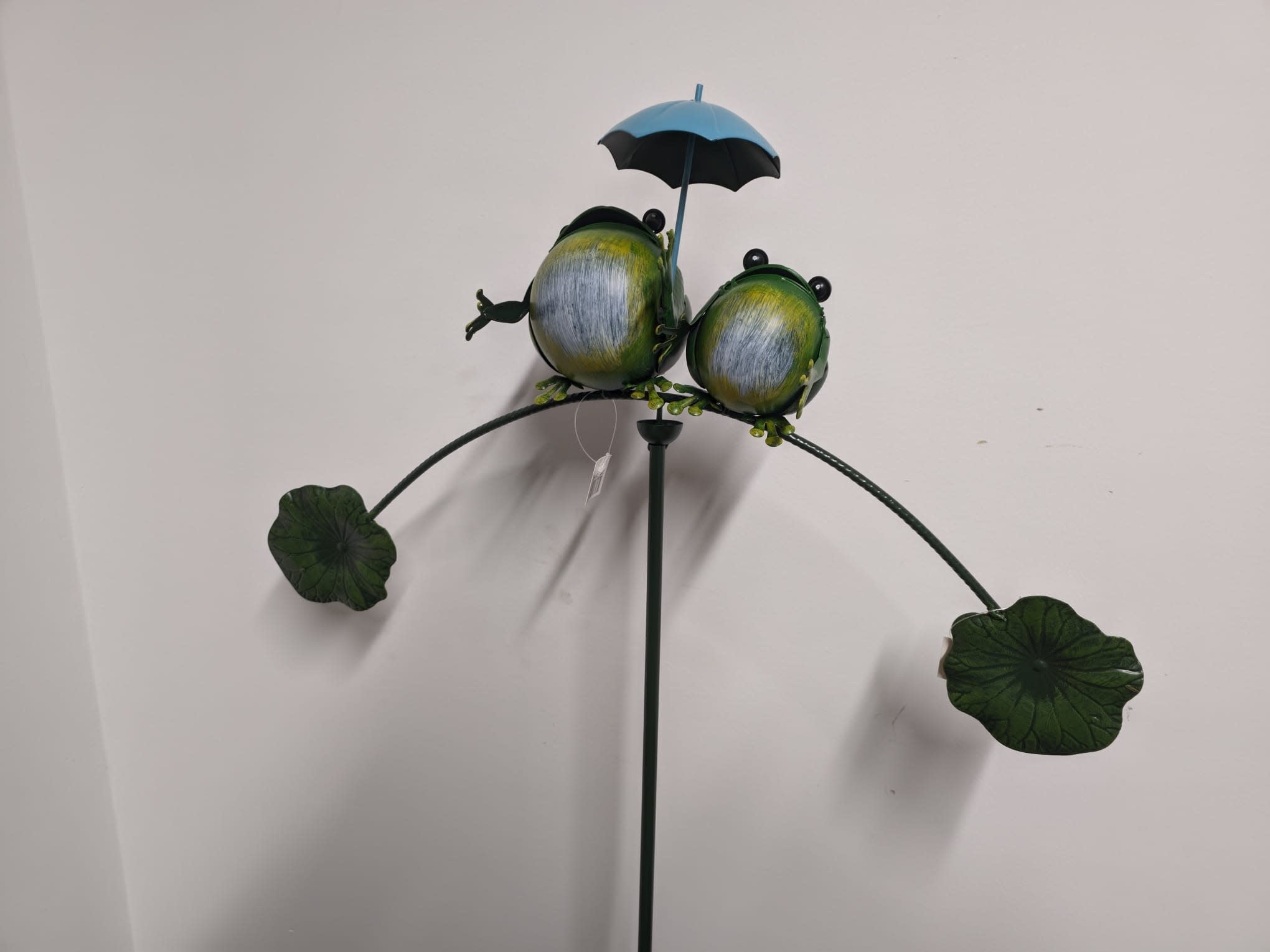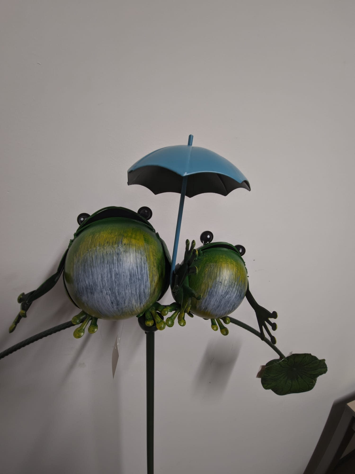 In elke tuin zal deze vrolijk gekleurde tuinsteker met twee kikkers onder een blauwe paraplu een leuke toevoeging zijn in uw tuin.