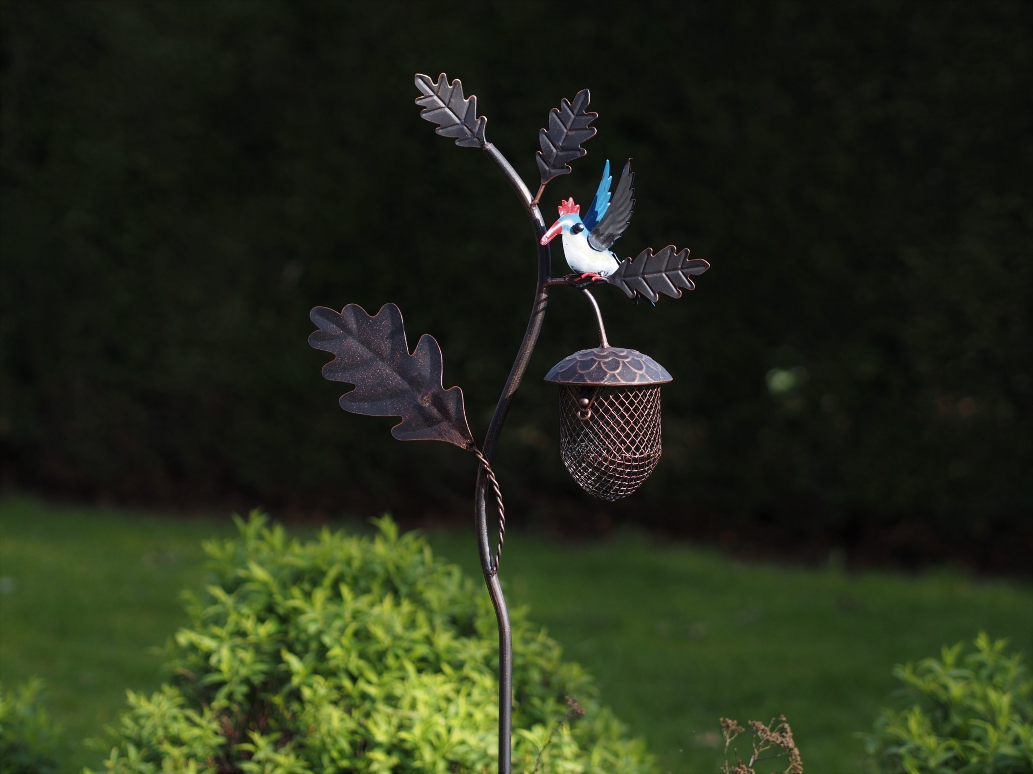 Schitterend afgewerkte metalen ijsvogel met voerkorfje die u overal in de tuin kunt steken.