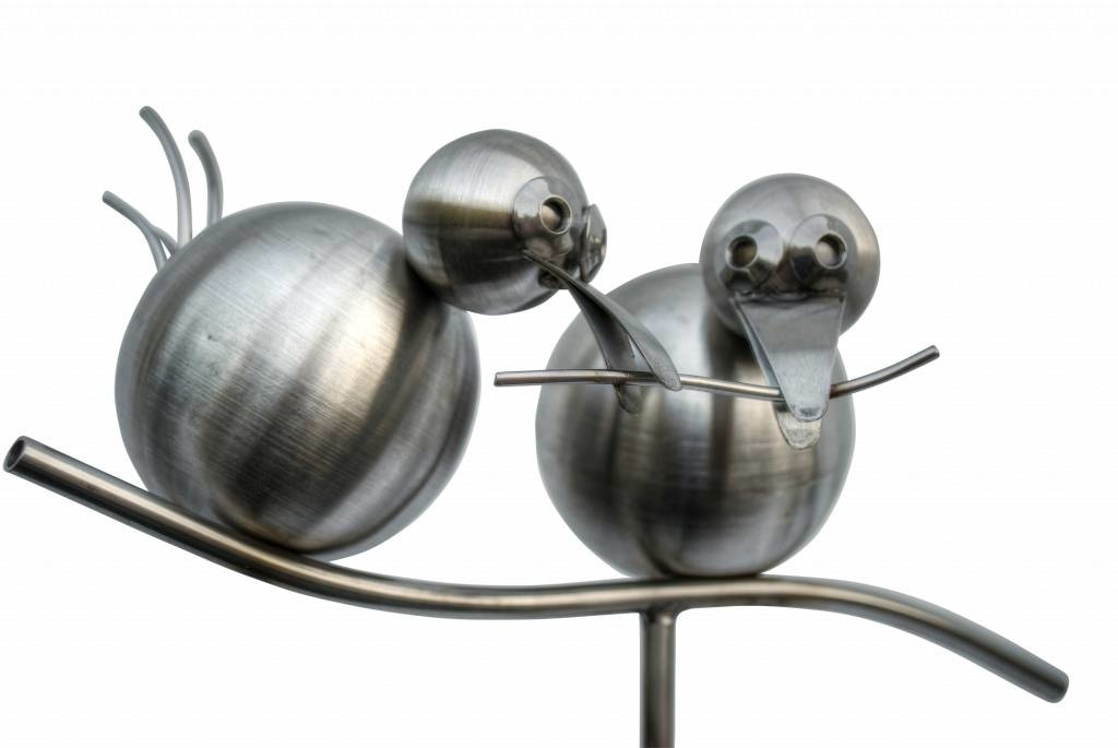 Tuinsteker met 2 vogeltjes op een tak, met een levenslange levensduur bij normale omstandigheden.Geheel is ambachtelijk gemaakt van rvs. Doordat het handwerk is zullen er altijd kleine verschillen in elk exemplaar kunnen bestaan met de foto, hiermee kan niet gereclameerd worden.