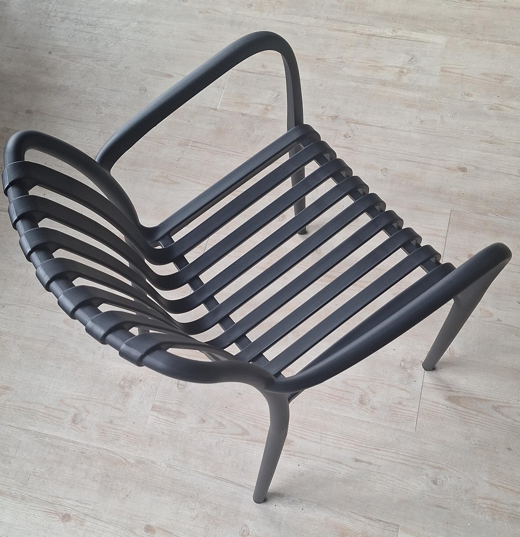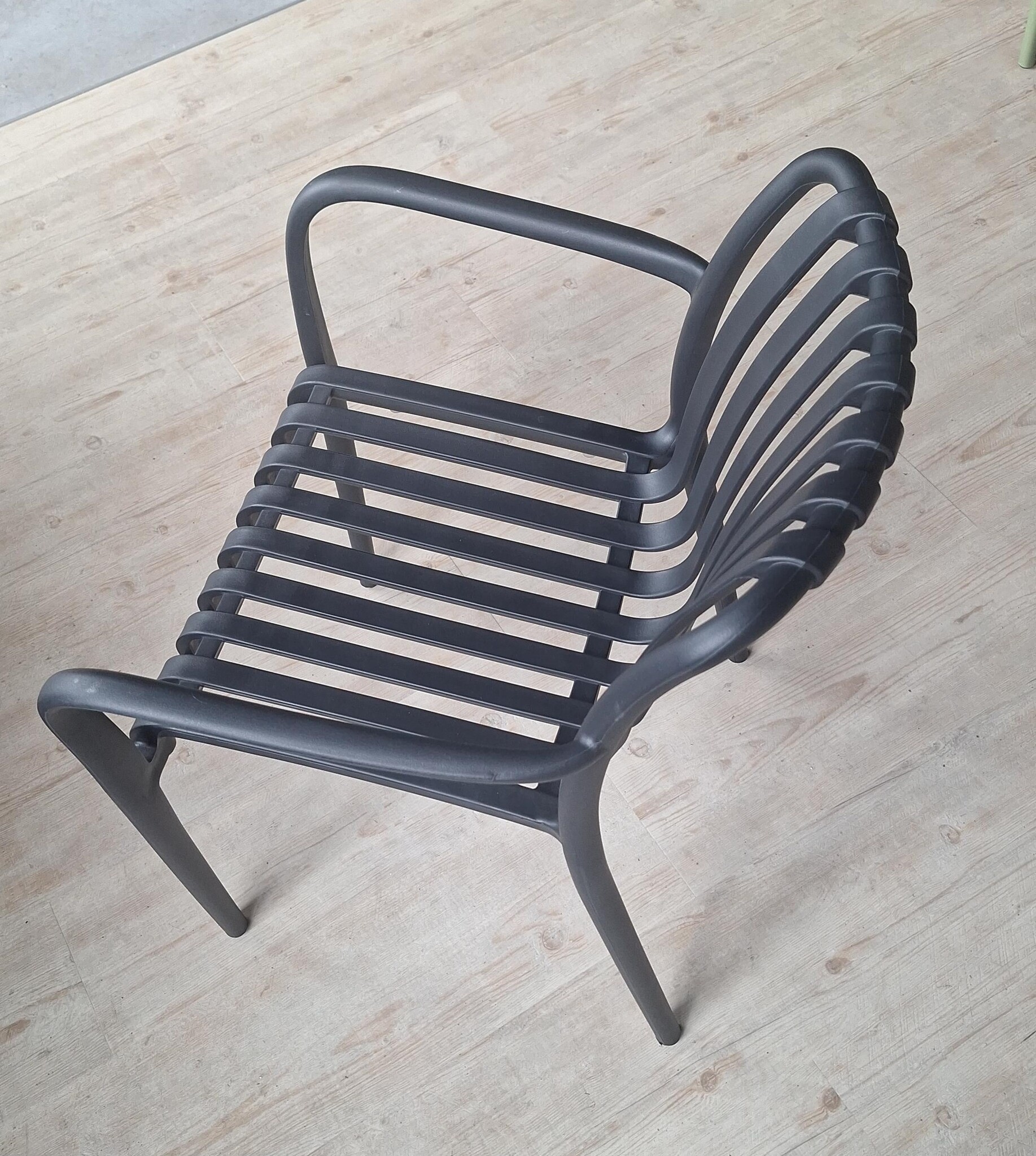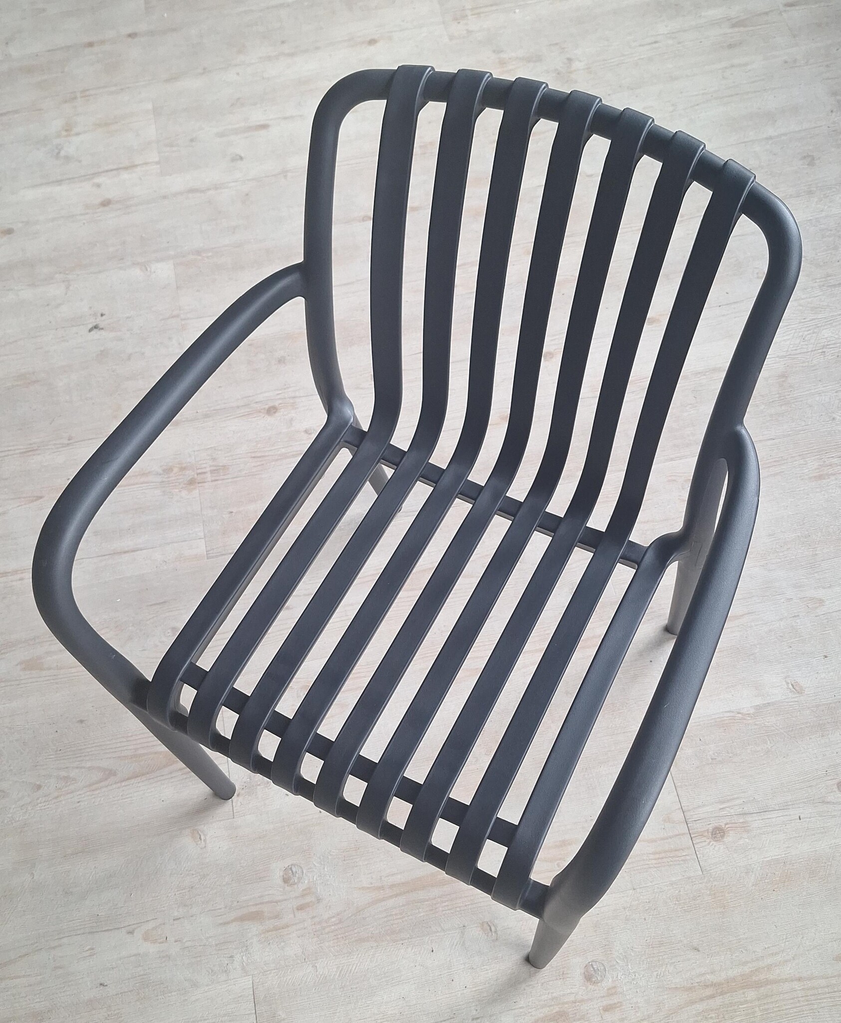 Leuke moderne tuinstoel, uit een stuk gemaakt van het duurzame polypropyleen. Stoel is stapelbaar en kleurvast. Massieve stoel geen holle poten. Omdat het zo’n leuk model is, met een bijkleurende kussen, wordt deze stoel ook voor binnen gebruikt.