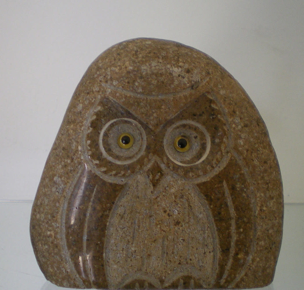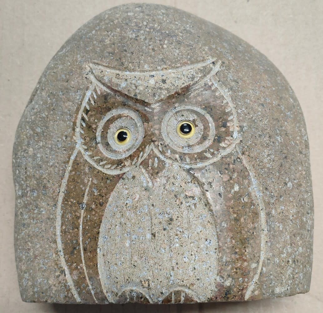 Prachtige stenen beeld van een uil, met de hand gemaakt op een zwerfkei van 15cm. Eerst wordt de afbeelding op de kei getekend, waarna met een beiteltje de lijnen en sommige oppervlakken uitgehakt worden, zodat er diepte verschillen ontstaan. De hoogst liggende delen worden daarna zorgvuldig gepolijst. Een enorme klus, maar het resultaat mag er dan zijn.