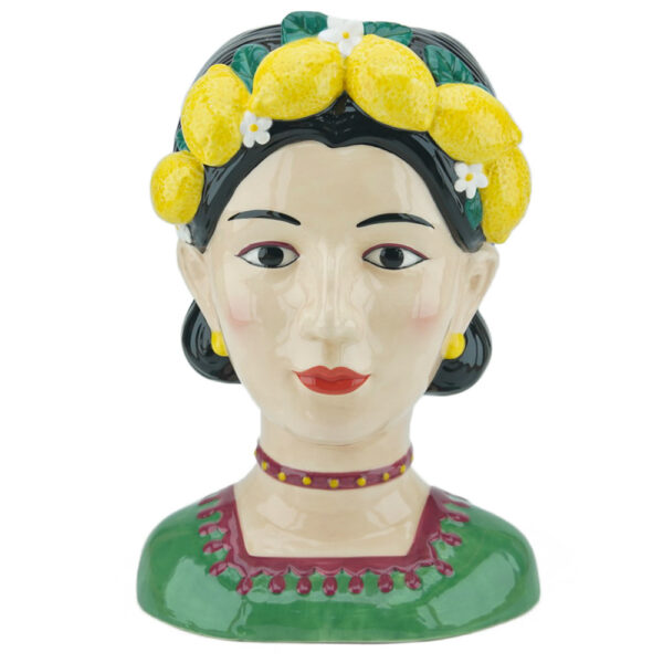 Op de vaas is een kleurrijke jonge dame te zien met citroenen om haar haar.  Met lichte make-up, fleurige haarband, vele sieraden en een Aziatisch uiterlijk. De pot bevat vele keuren als groen, zwart, geel en witte huidskleur. De vaas heeft een glanzende finish en is gemaakt van porselein.
