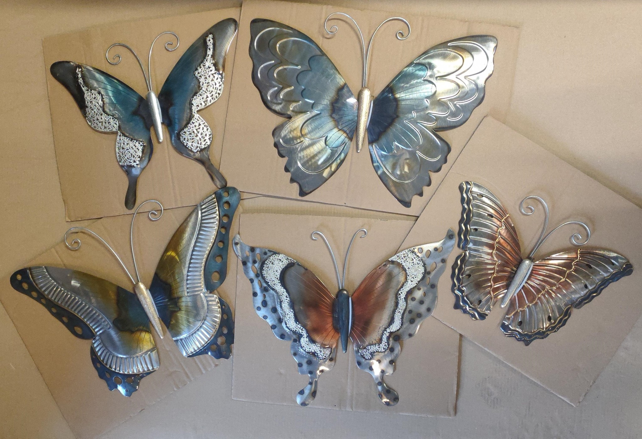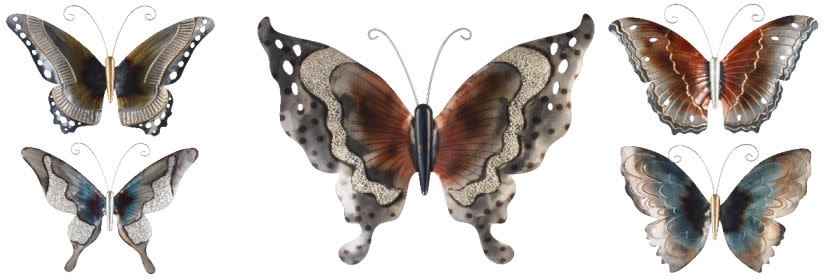 Laat je fantasie zijn gang gaan en maak uw muur binnen of buiten gezellig en fleurig met deze set van 5 grote metalen vlinders. Hang ze op zoals jij dat wilt; in een rij, boven elkaar, diagonaal of gewoon door elkaar. Deze muurvlinders zijn van metaal en zitten gesorteerd in een verpakking. Bij het uitpakken vleugels en voelsprieten beetje uitvouwen.