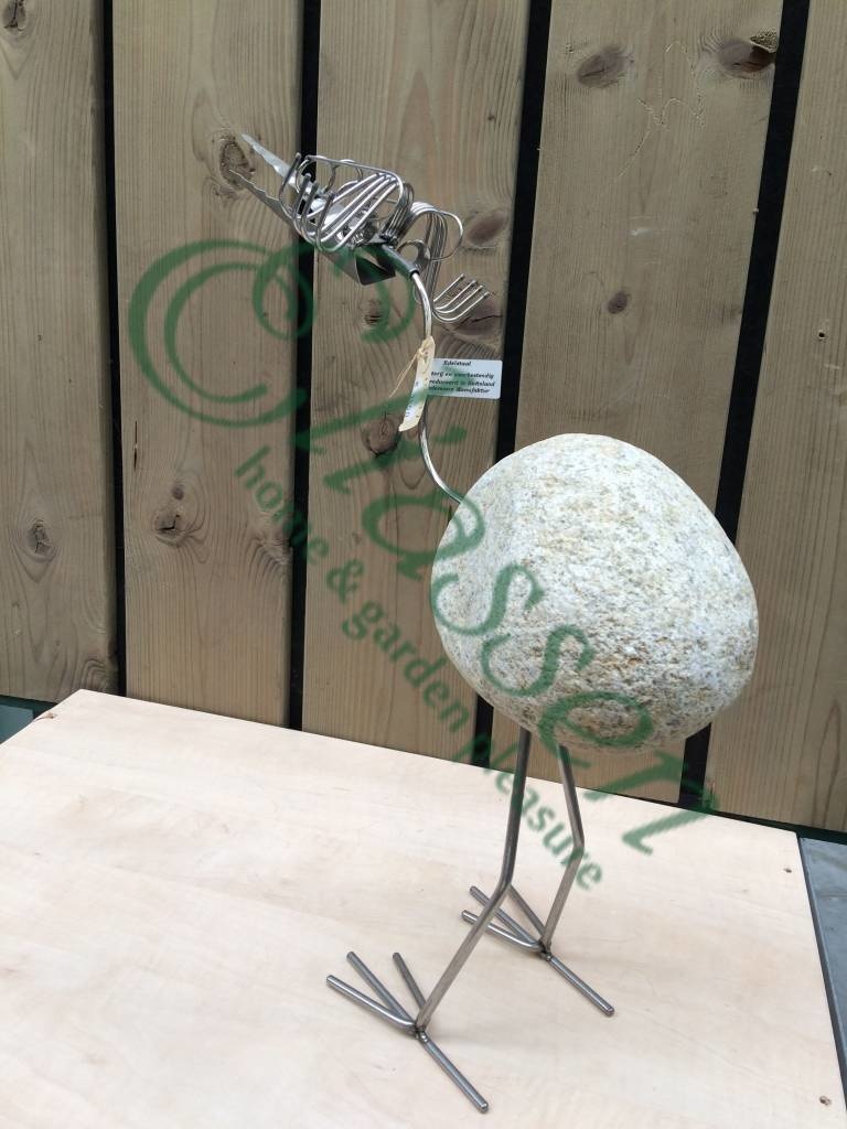 Leuk in de tuin maar ook binnenshuis, deze exclusieve figuur van een vogel met een natuurkei als lijf. Stevig staand, met een levenslange levensduur bij normale omstandigheden.Geheel is ambachtelijk gemaakt van RVS. Doordat het handwerk is zullen er altijd kleine verschillen in elk exemplaar kunnen bestaan met de foto, Ook de kei kan anders zijn qua kleur en vorm, hierop kan niet gereclameerd worden.