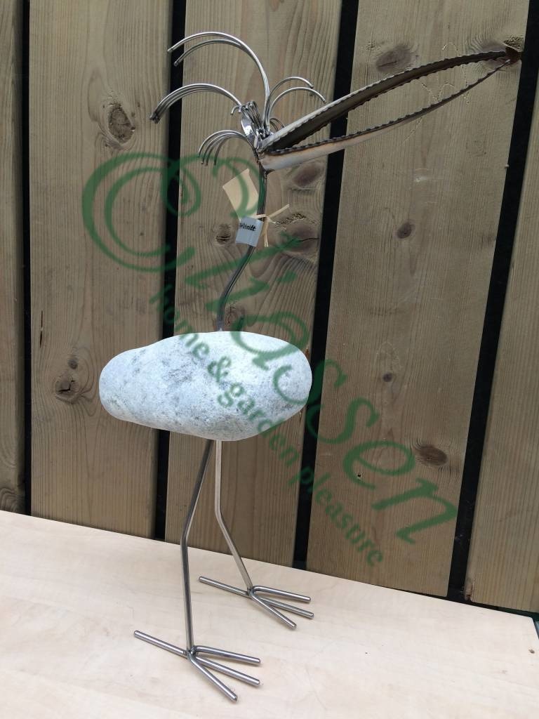 Leuk in de tuin maar ook binnenshuis, deze exclusieve figuur van een vogel met een natuurkei als lijf. Stevig staand, met een levenslange levensduur bij normale omstandigheden.Geheel is ambachtelijk gemaakt van rvs. Doordat het handwerk is zullen er altijd kleine verschillen in elk exemplaar kunnen bestaan met de foto, Ook de kei kan anders zijn qua kleur en vorm, hierop kan niet gereclameerd worden.