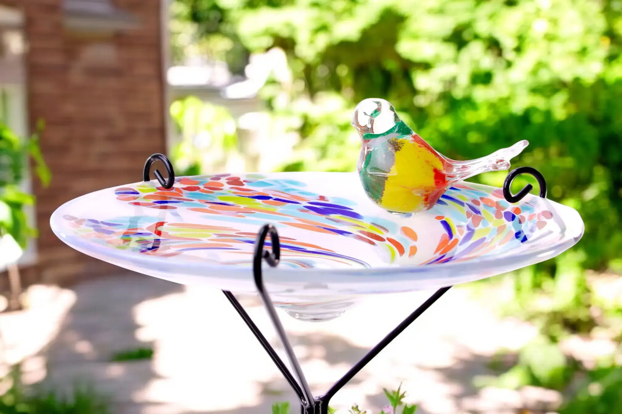 In elke tuin zal deze wit met kleuren glazen vogeldrinkschaal op tuinsteker een leuk plekje kunnen krijgen.