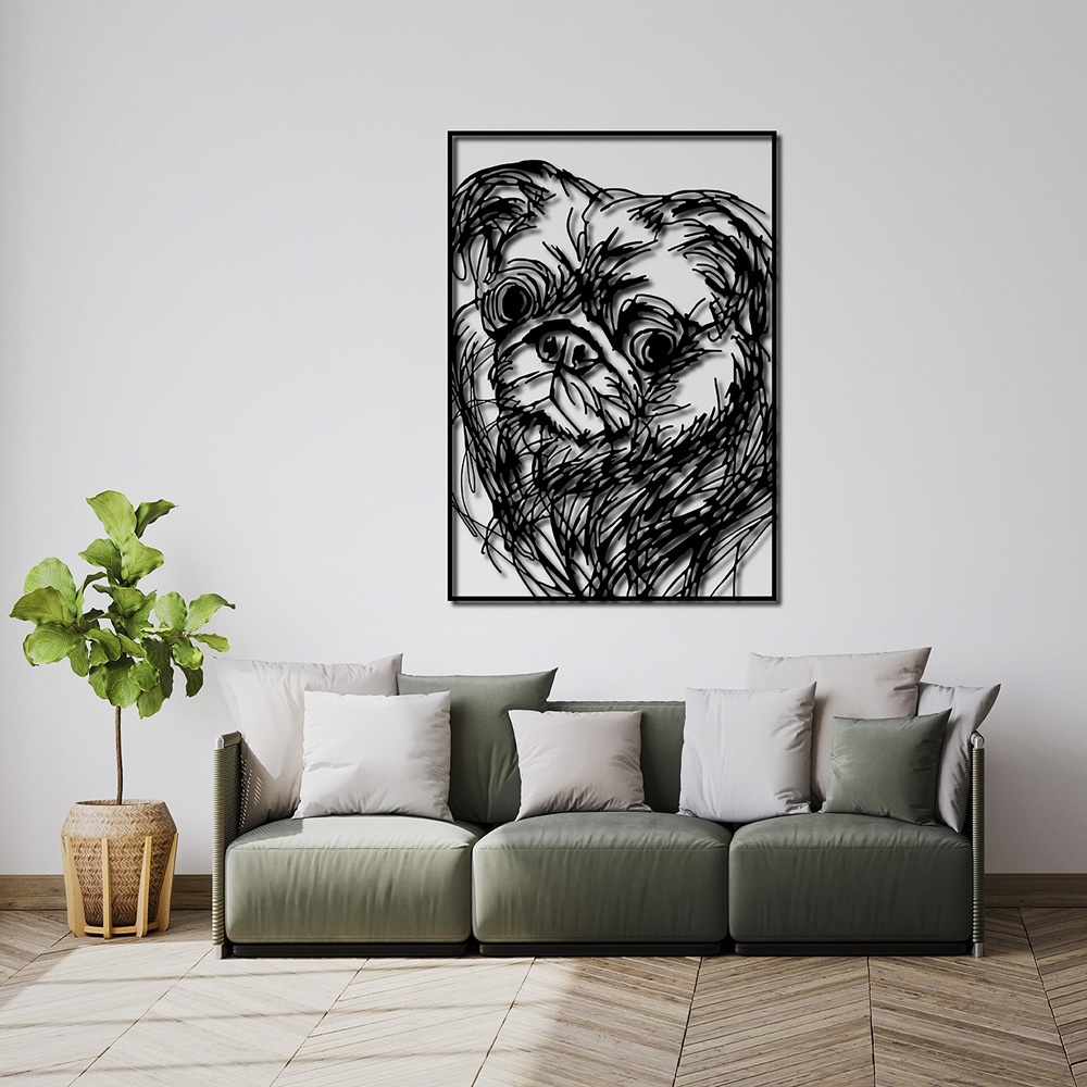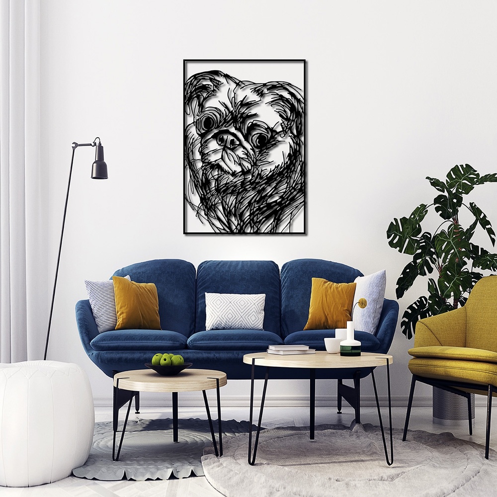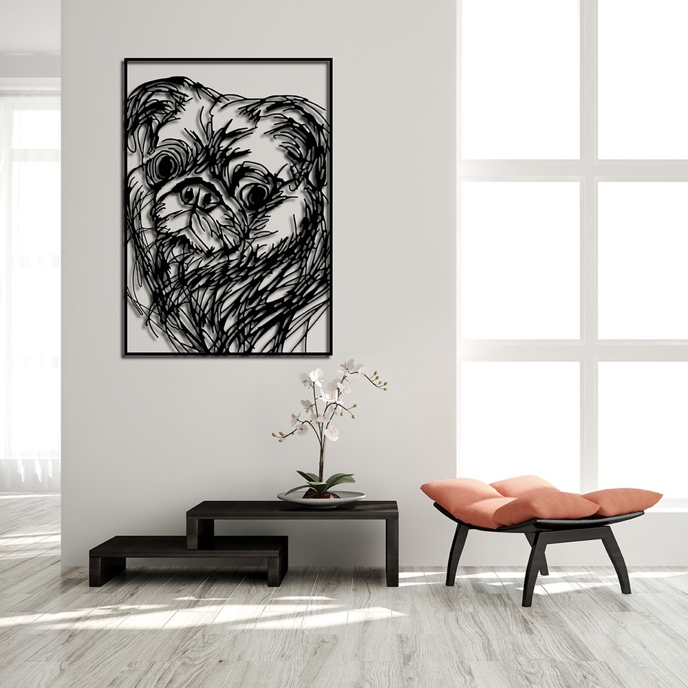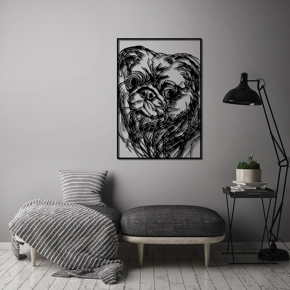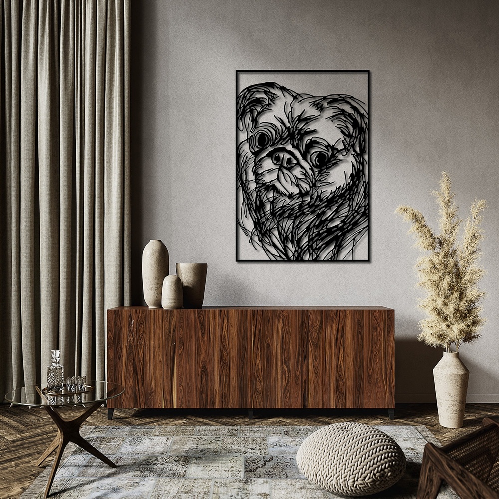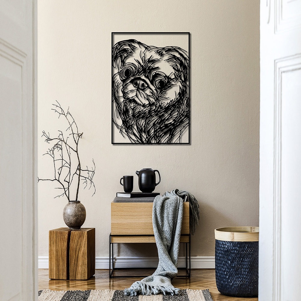 Deze grote ronde zwarte moderne wanddecoratie hangt prachtig in elk modern interieur, maar ook in uw bedrijfspand, praktijk, maar ook buiten onder een veranda is deze muurversiering een grote sfeermaker. Deze metalen muurdecoratie is nauwkeurig gemaakt met de allernieuwste laser apparatuur, waardoor zoals deze muurversiering in de vorm van een mopshondje, figuratief uitgebeeld, haarscherp is uitgesneden. Het materiaal wat is gebruikt voor dit muurobject is plaatstaal van maar liefst 1,5mm dik, waardoor deze wandversiering niet zal gaan kromtrekken. Schroefjes in deze wanddecoratie zorgen er voor dat deze wanddeco ca 1 cm vrij hangt van de muur, waardoor een zeer mooi schaduw beeld en 3d-effect bereikt wordt.