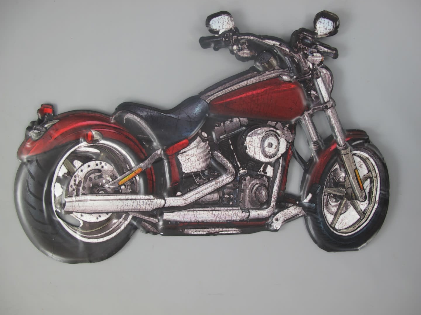 Deze wanddeco is gemaakt van plaatstaal, met een gespoten ondergrond met daarover een transfer en vaak een omgekrulde rand.