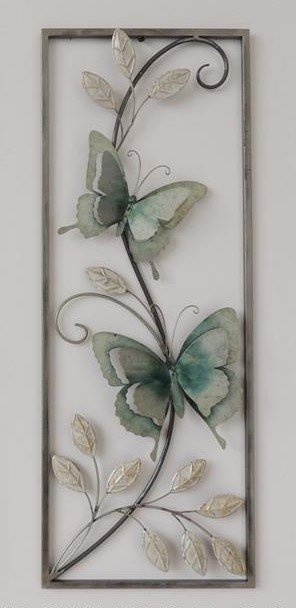 Helemaal met de hand vervaardigde metalen muurdecoratie, met kader, model met vlinders. Een prachtige aanwinst voor uw huis of buiten onder een veranda. Aangezien het met de hand geschilderd is, is elk exemplaar uniek, en kan de vorm of kleur enigzins afwijken van de foto.