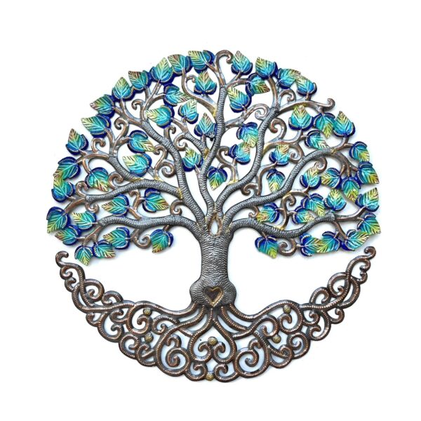 Dit stuk muurdecoratie is een lust voor het oog. Dit model muurdeco van een levensboom is gemaakt in Haiti, door de zgn Bosmetal werkers, en van de bovenkant van een oliedrum, en hiermee is men dagenlang aan het werk om dit product te realiseren. Knippen, met hamer bollen of juist vlakken, met drevel bewerken en schilderen. Als men de artikel goed bekijkt sta je er versteld hoeveel werk moet zijn geweest. Als u dit artikel bestelt steunt u de wereldwinkel organisate Our Market en steunt u deze mensen in het straatarme Haiti.