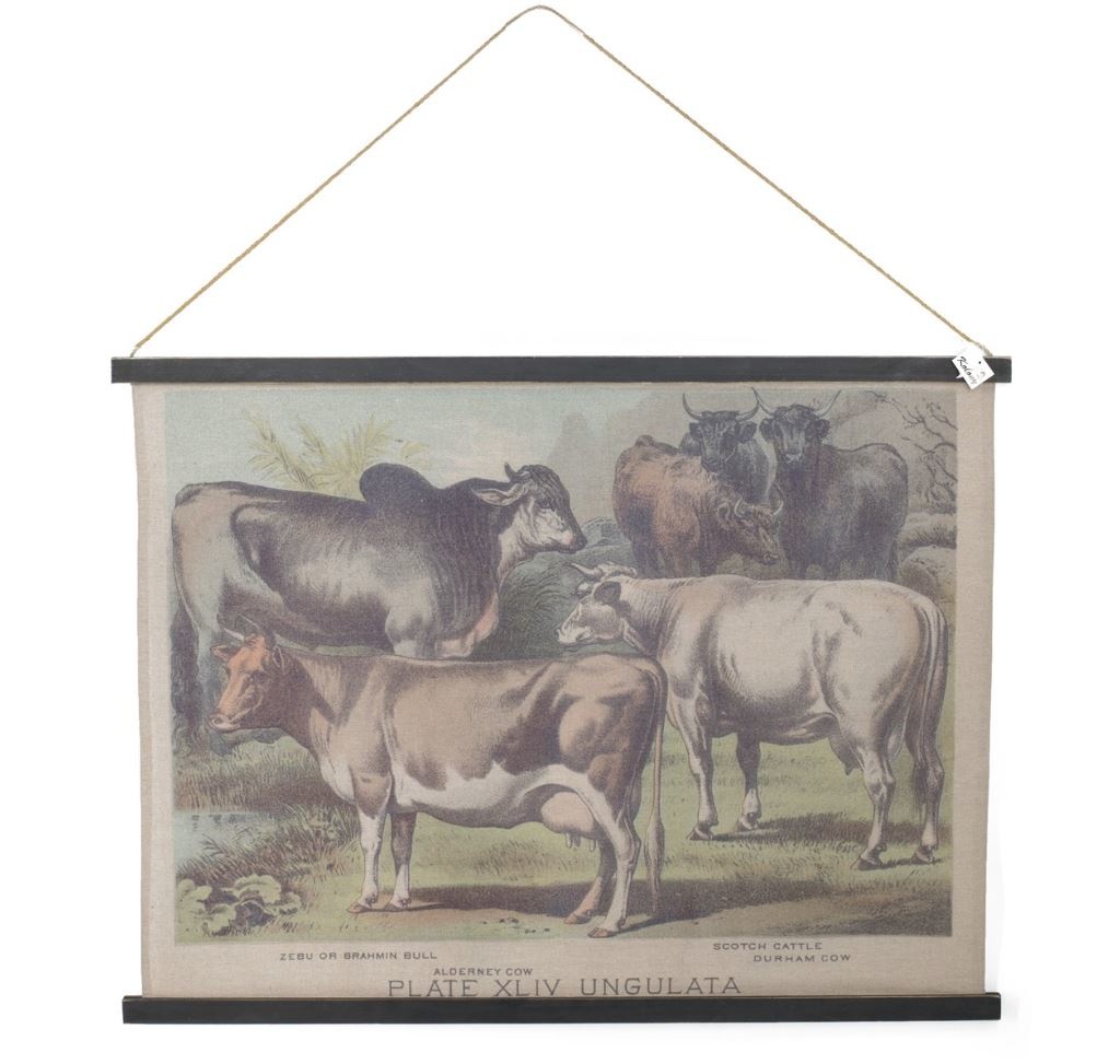Deze grote wandkaart van 3 koeien is een oude afbeelding van een oud origineel schoolplaat en is een betaalbaar stuk muurdecoratie voor elk interieur. Deze schoolplaat is gemaakt van echt linnen, geen papier dus. De maat van deze oprolbare wanddecoratie is 100x75cm.