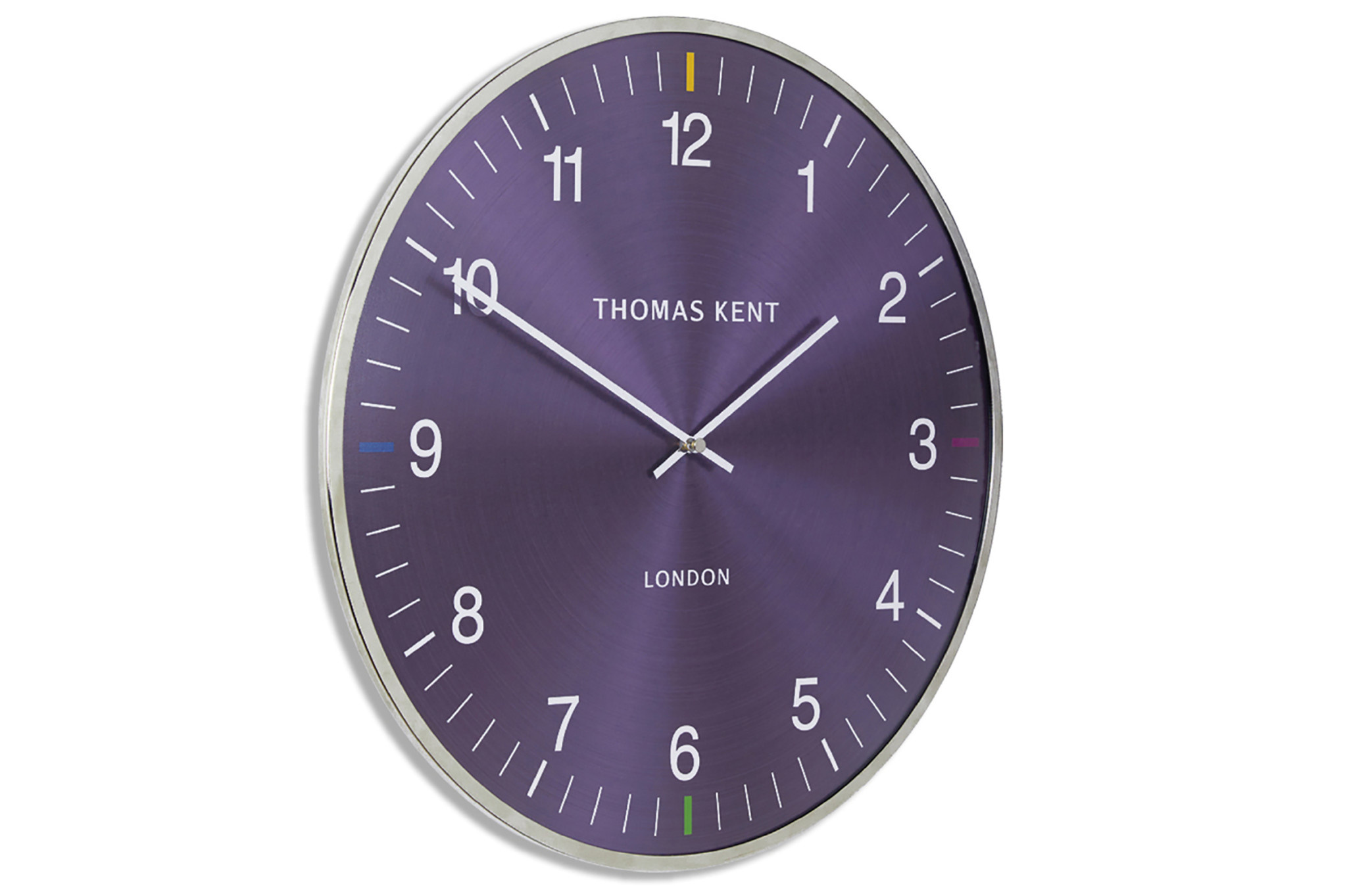 De strakke vormen van deze ronde muurklok in combinatie met de paars, zilveren achtergrond en het bolle glas zorgen ervoor dat deze muurklok in elk interieur zal passen.