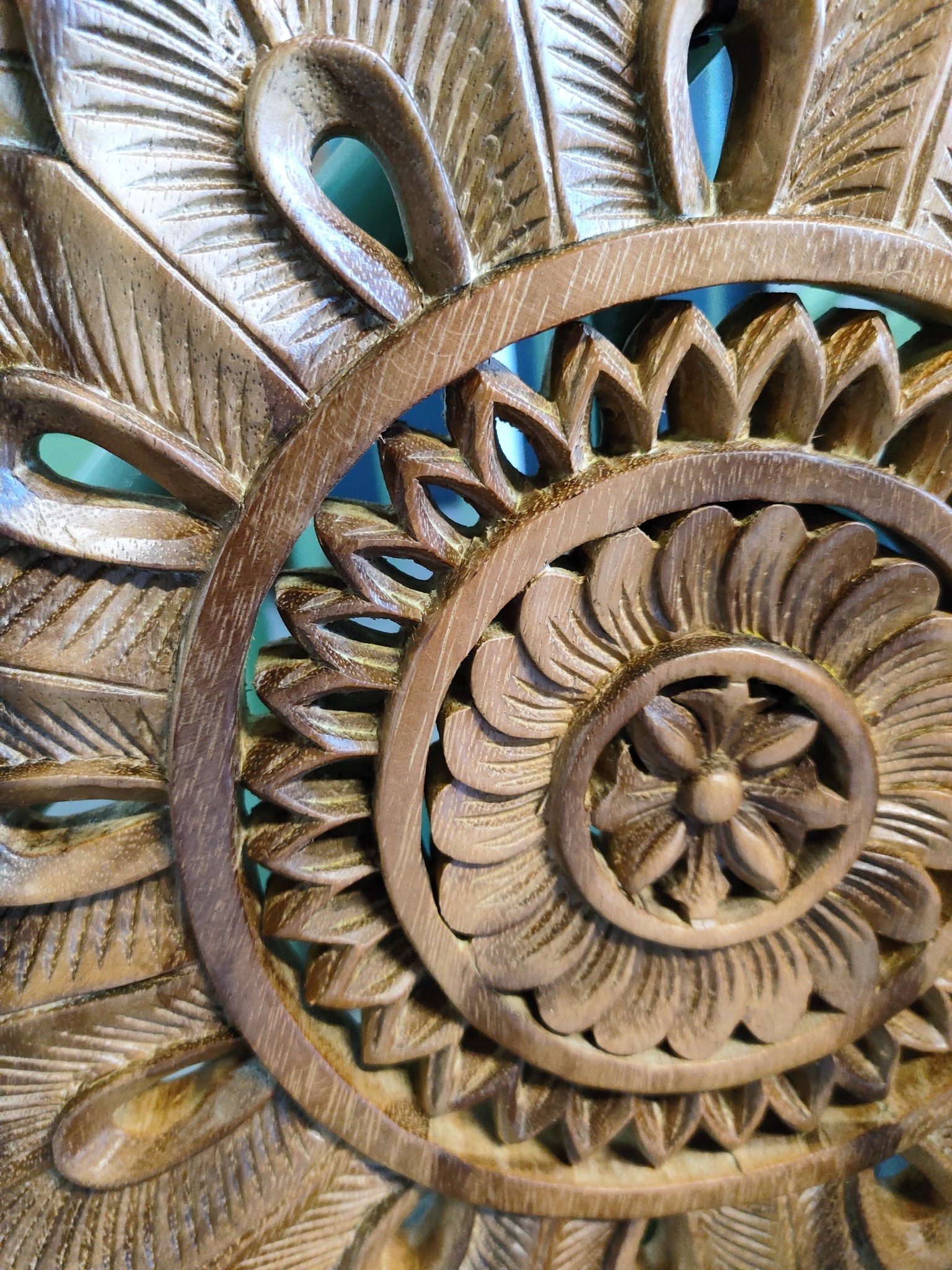 Mooi Houten wandpaneel of mandala ,handmatig gemaakt van massief Suar hout. Heel veel uren snijwerk zit in dit houten paneel. Alles wat je ziet; elk krulletje en takjes, alles is gemaakt door mensen handen.