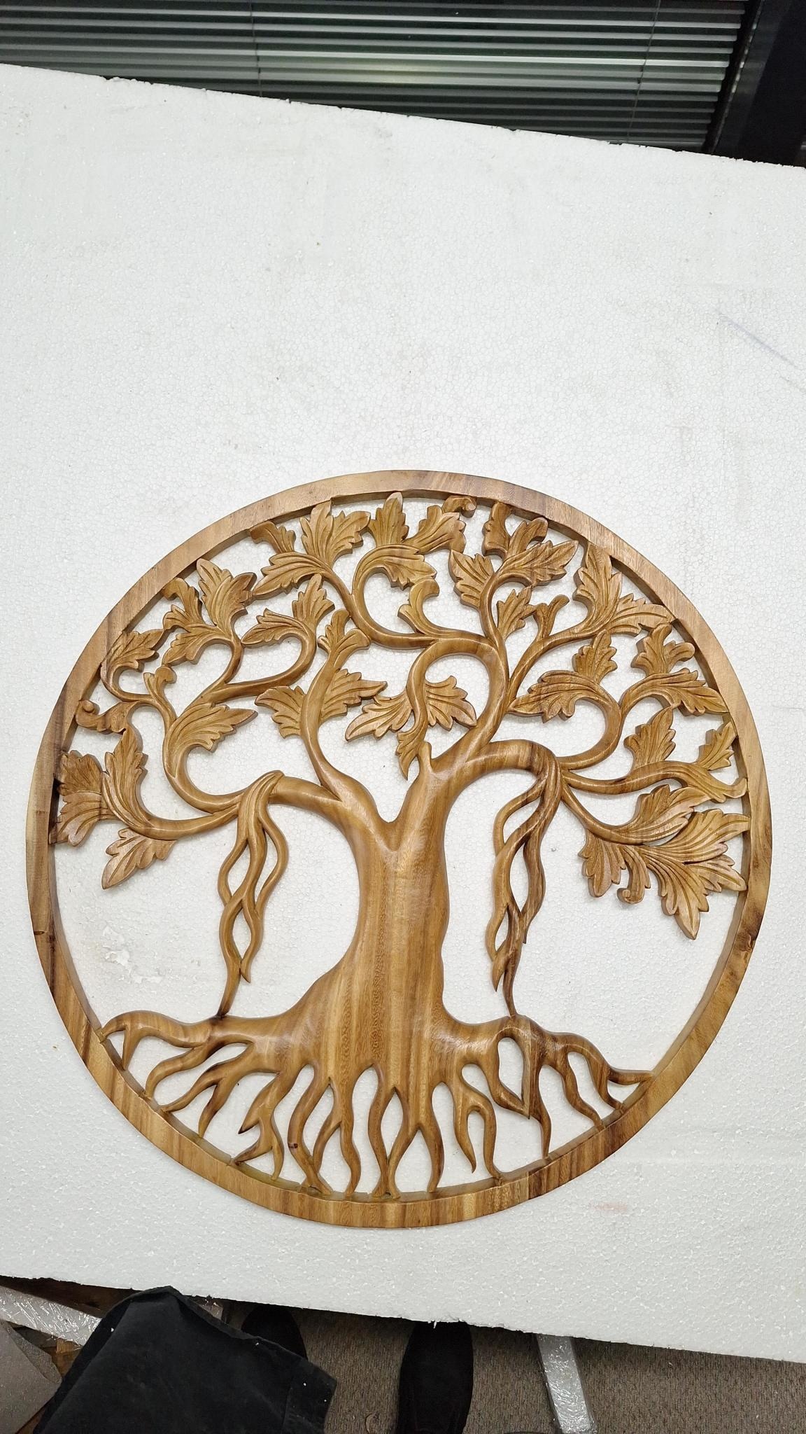 Houten wandpaneel handmatig gemaakt van massief Suar hout. Afgebeeld is een prachtige levensboom. Heel veel uren snijwerk zit in dit houten paneel. Alles wat je ziet; elk krulletje Mooi en takjes, alles is gemaakt door mensen handen.