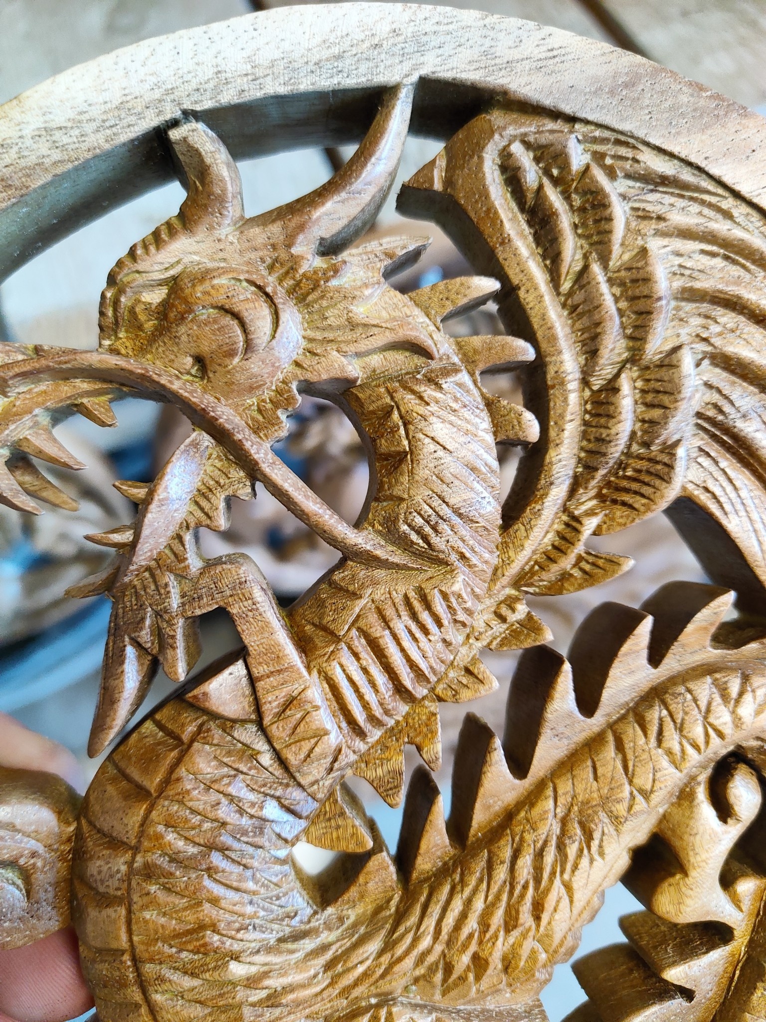 Mooi Houten wandpaneeltje handmatig gemaakt van massief Suar hout. Afgebeeld is een prachtige Slangendraak in de bekende hindoestaanse houding. Heel veel uren snijwerk zit in dit houten paneel. Alles wat je ziet; elk krulletje en takjes, alles is gemaakt door mensen handen.