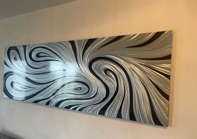 Wilt u een bijzondere XXL schilderij aan de muur hangen met een totaal eigen uitstraling? Dan mag u dit zeer moderne aluminium schilderij van het exclusieve merk ArtEl absoluut niet missen. Helemaal met de hand vervaardigd. Door het vele handmatige schuur en polijstwerk op een aluminiumplaat, in combinatie met de gekozen heldere kleuren, wordt er een hypermoderne en eigentijds stuk muurdecoratie voor uw werk- en leefomgeving gecreëerd. Dit schilderij is bijna 3cm dik, achterzijde is mooi afgewerkt met zwarte velours, en voorzien van haakjes.