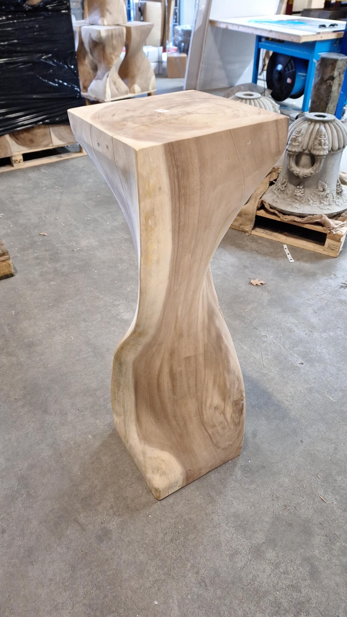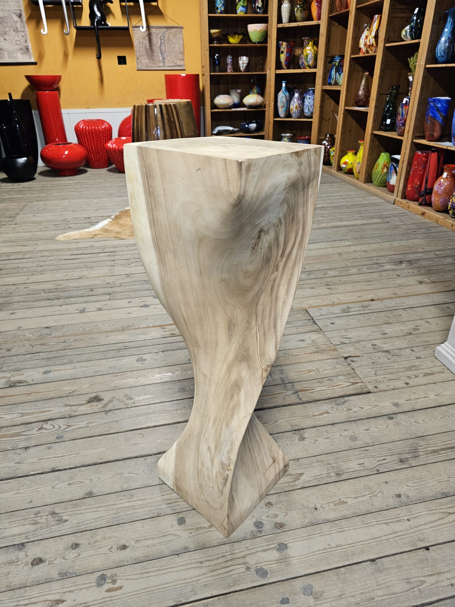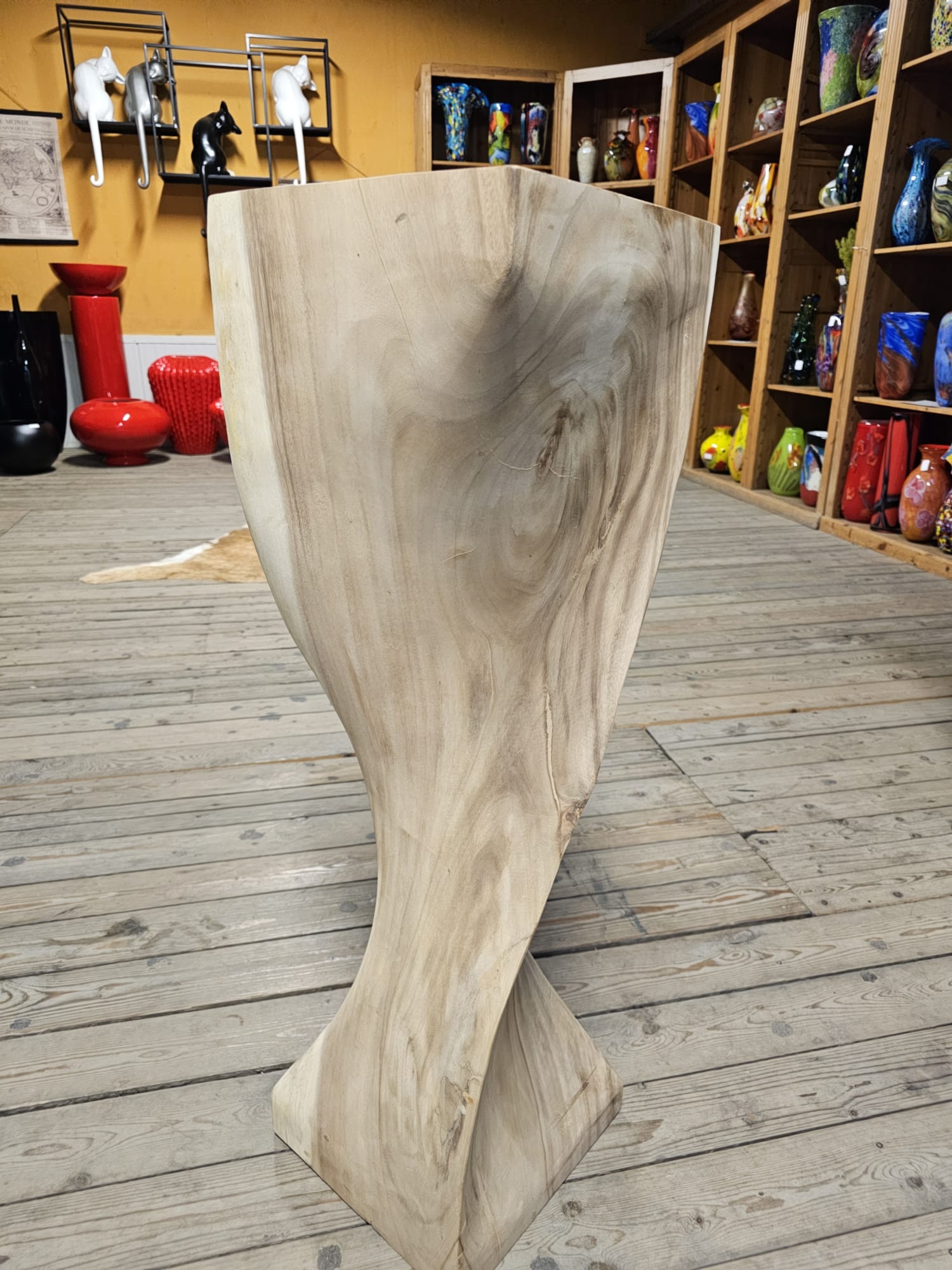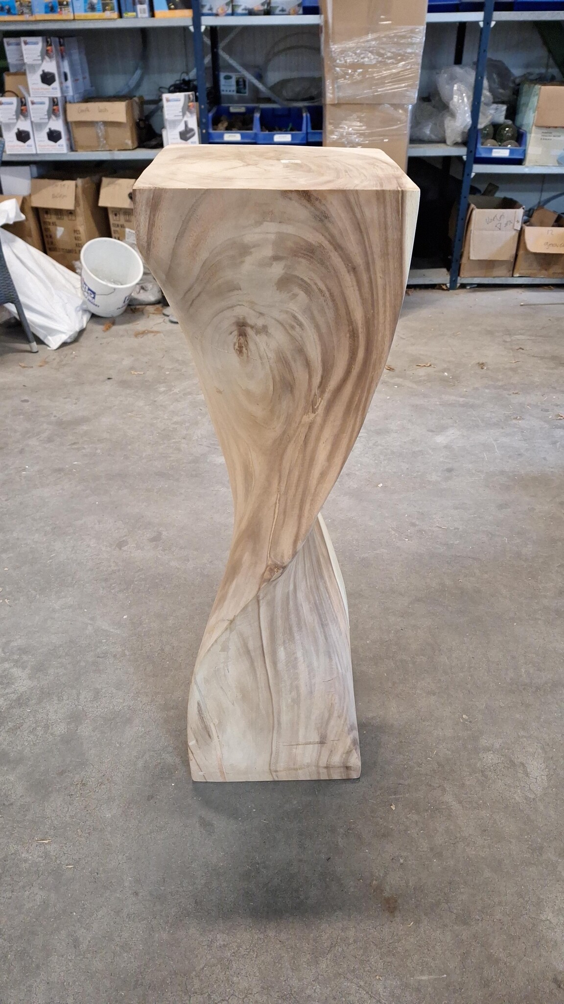 Gemaakt van een blok suar hout, prachtig afgewerkt, mooi glad gemaakt. Prachtige elegantie en aparte gedraaide vorm. Supermooi en elegant in combinatie met een beeld, pot met plant, enz. Houd u er rekening mee dat in groot volume hout scheuren kunnen ontstaan.