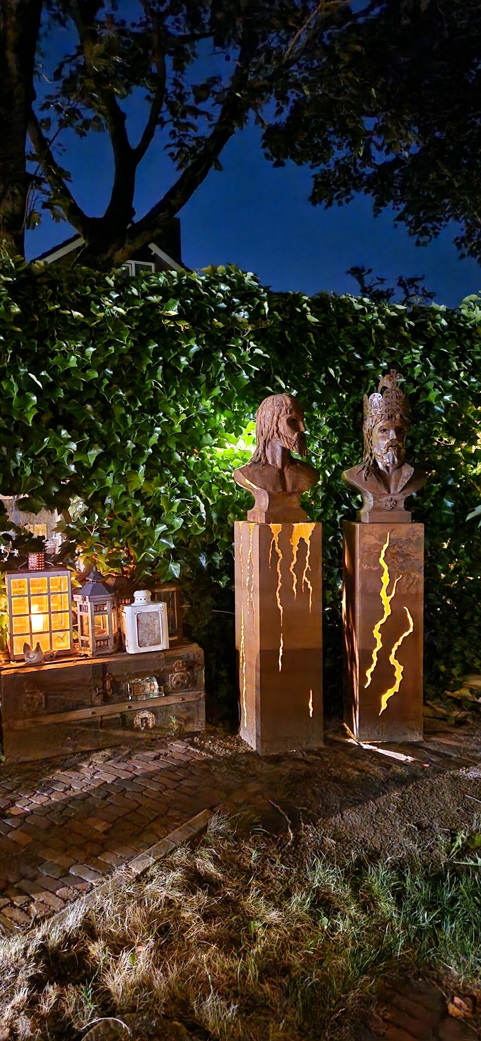 Een aparte sfeermaker in uw tuin, deze verlichte zuil in barokstijl toch wel noemen. In deze sokkel zijn zogenaamde scheuren gemaakt aan 2 zijden, waardoor in het donker warmwit licht schijnt. Deze kolom is gemaakt van 2mm dik onbehandeld ijzer, wat een prachtige en tijdloze (roest)bruine kleur geeft.