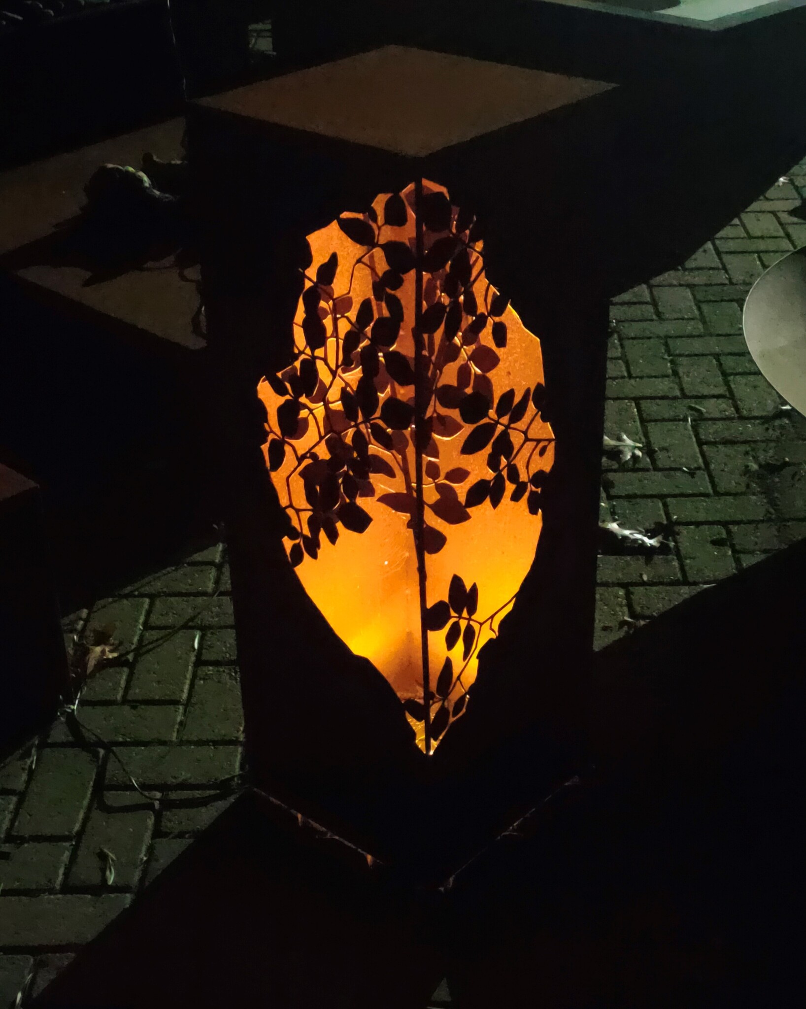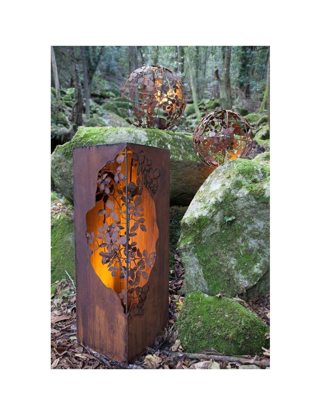 Een aparte sfeermaker in uw tuin, deze verlichte zuil toch wel noemen. In deze sokkel zijn zogenaamde bloemen gemaakt, waardoor in het donker warmwit licht schijnt. Deze kolom is gemaakt van 2mm dik onbehandeld ijzer, wat een prachtige en tijdloze (roest)bruine kleur geeft.