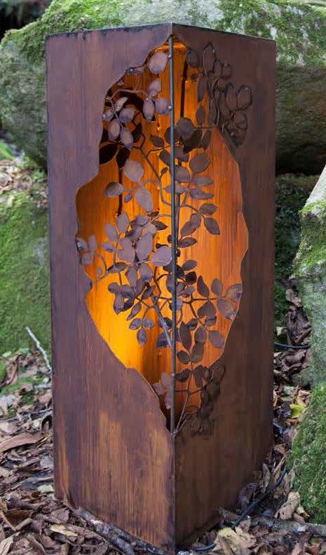 Een aparte sfeermaker in uw tuin, deze verlichte zuil toch wel noemen. In deze sokkel zijn zogenaamde scheuren gemaakt, waardoor in het donker warmwit licht schijnt. Deze kolom is gemaakt van 2mm dik onbehandeld ijzer, wat een prachtige en tijdloze (roest)bruine kleur geeft.